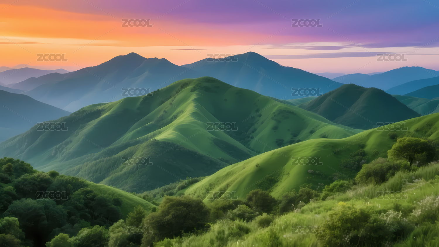 绿色山峦与紫橙天空