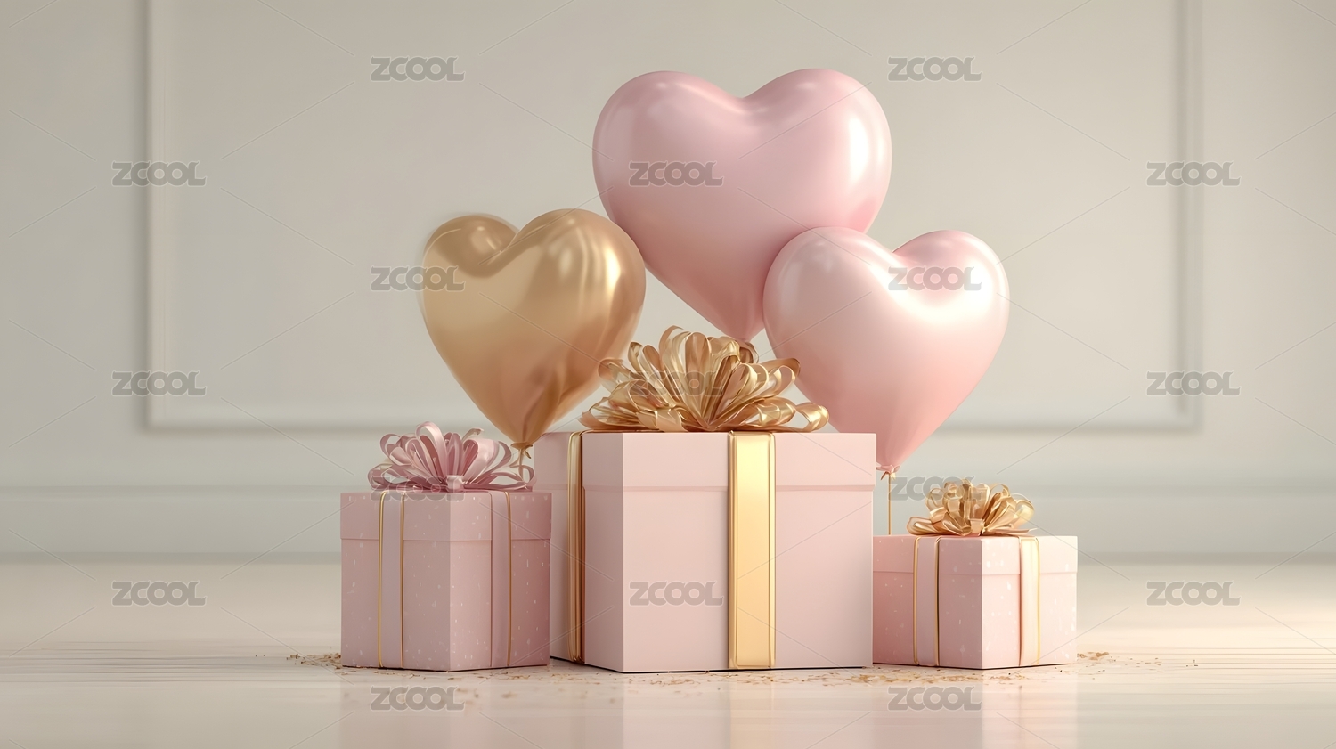 粉色心形气球与礼物盒的温馨场景