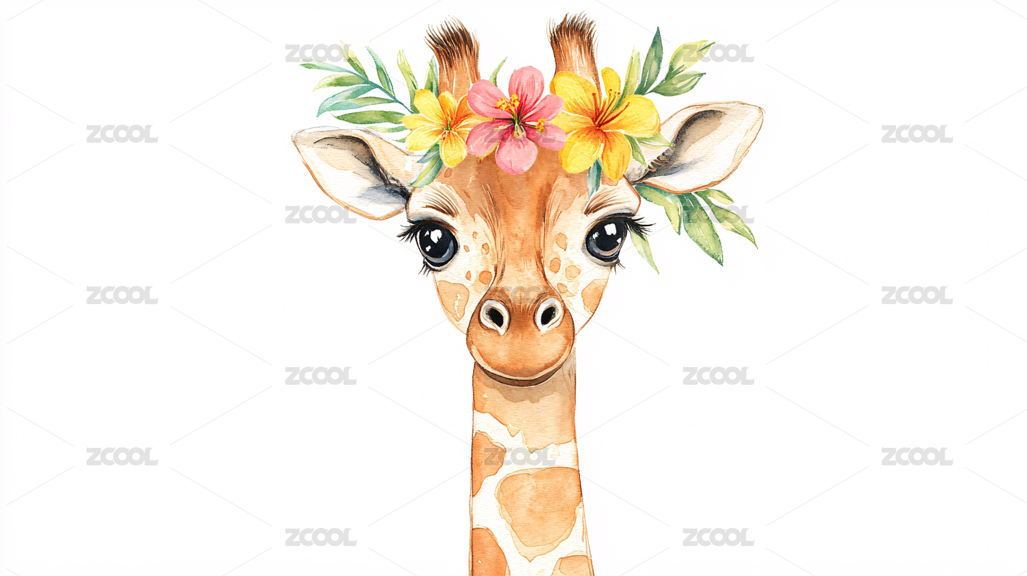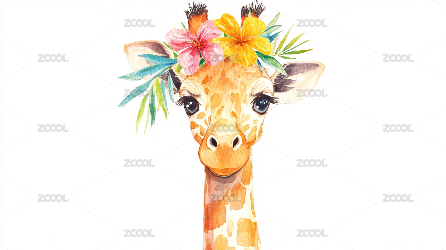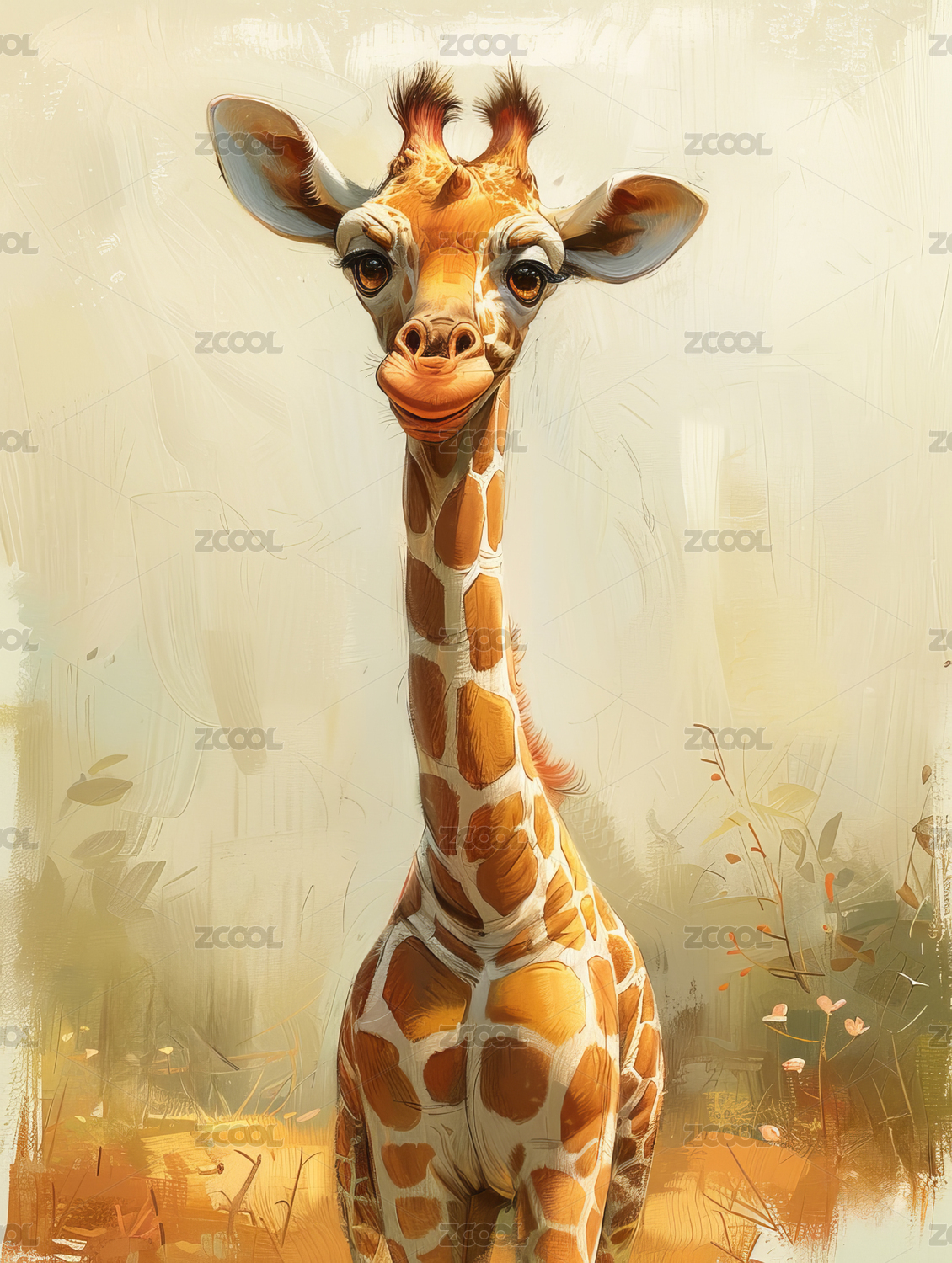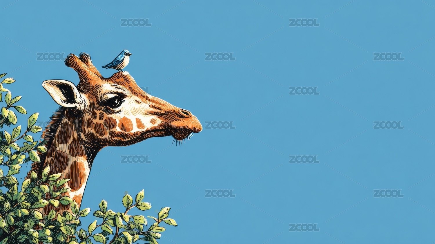 长颈鹿与鸟儿在蓝天下的和谐瞬间