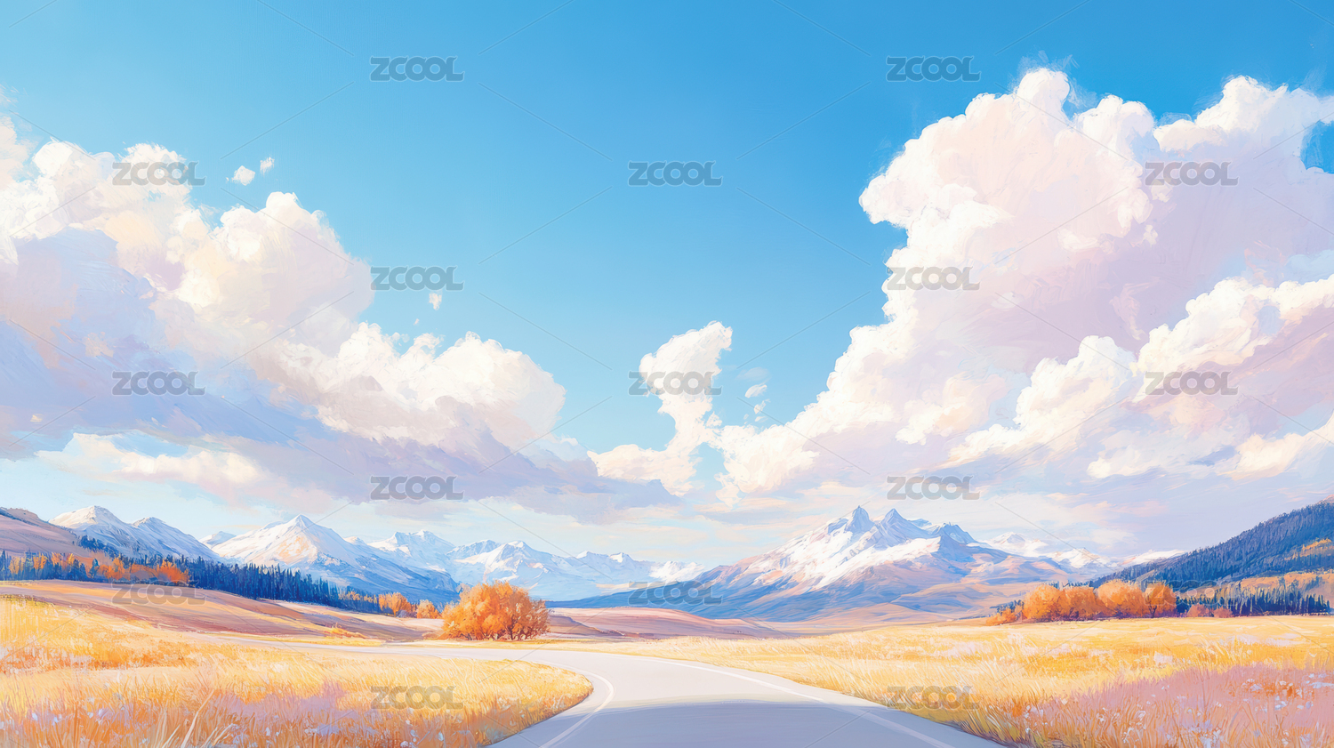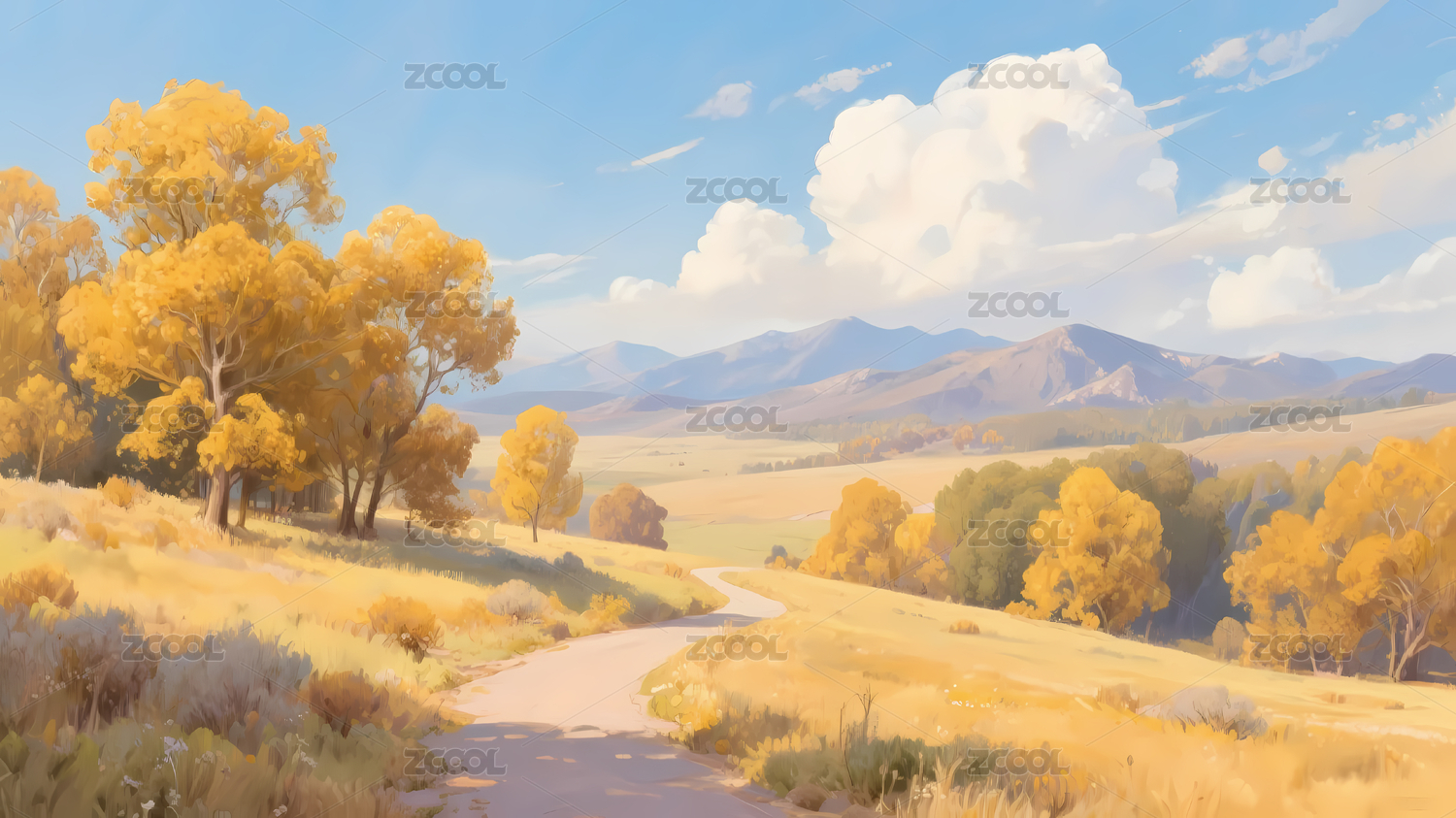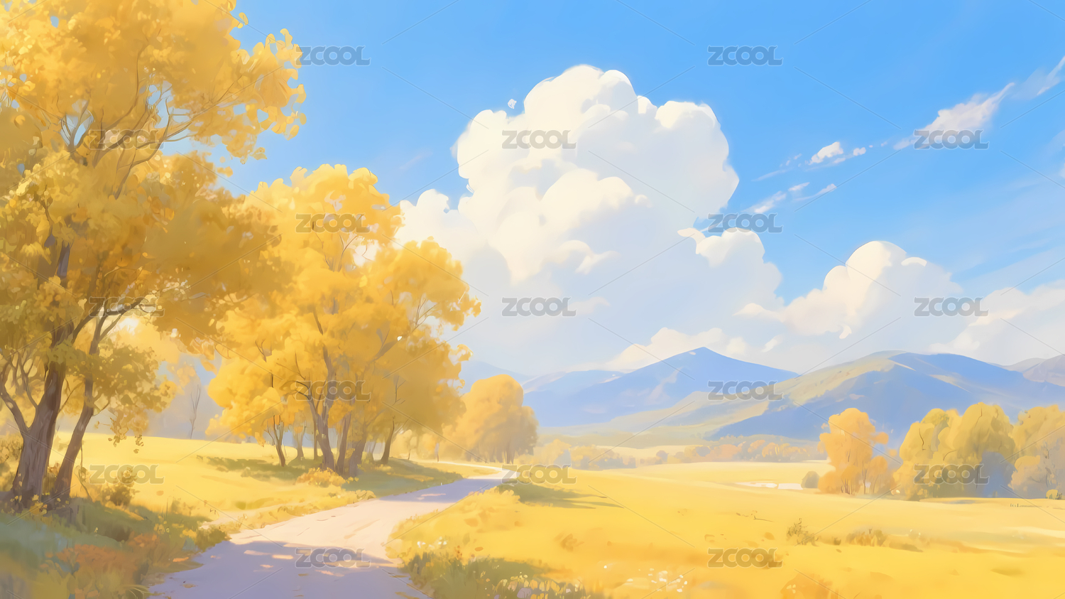 自然,和谐,小路,树木,山脉,蓝天,金黄,白云,秋天,生机