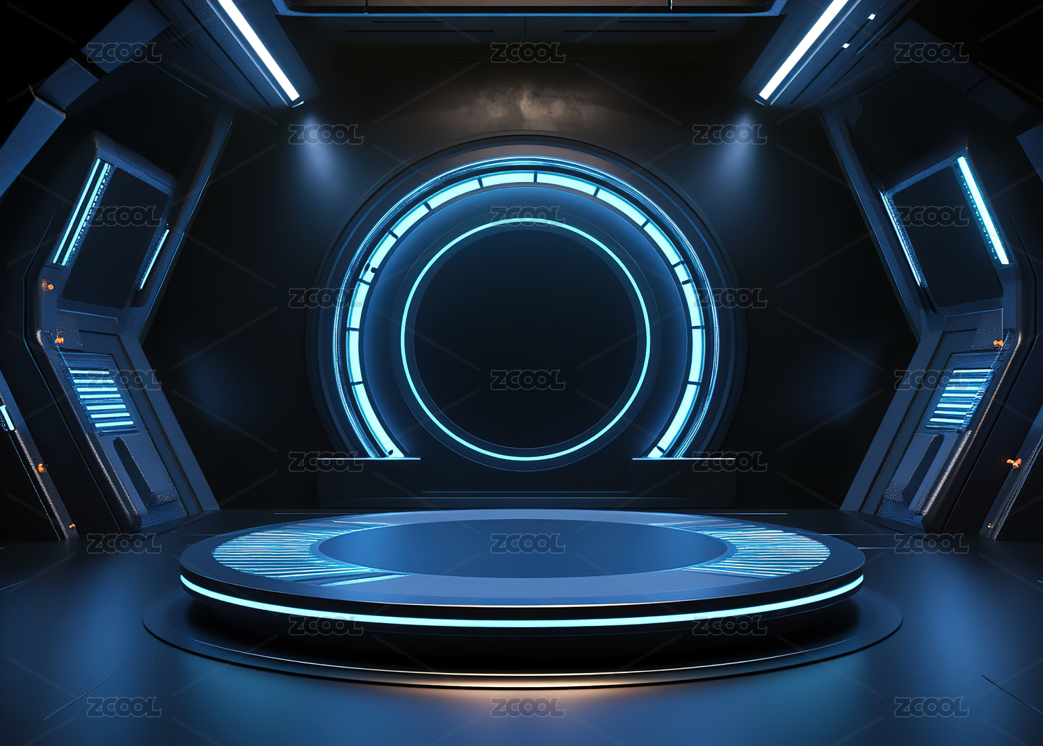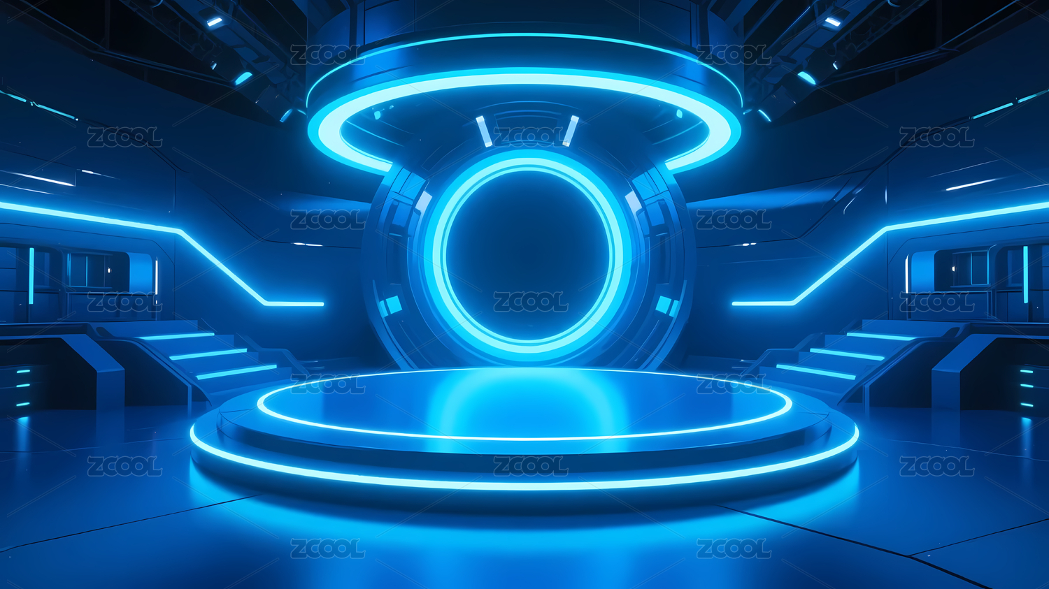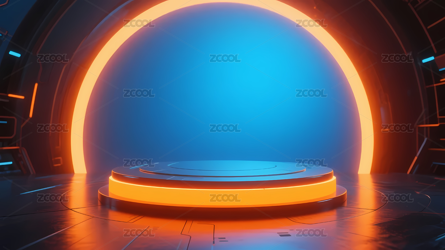 蓝色,背景,未来,圆形,橙色,对称,舞台,霓虹灯,柱子,科技感