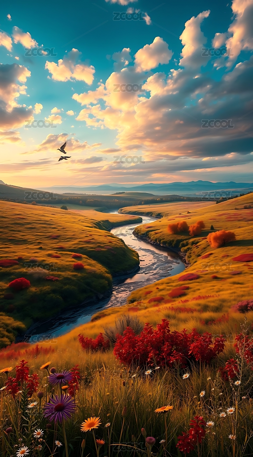 蓝天白云下的田园风光绿意盎然的小溪旁有几只羊在吃草远处有一座小木屋