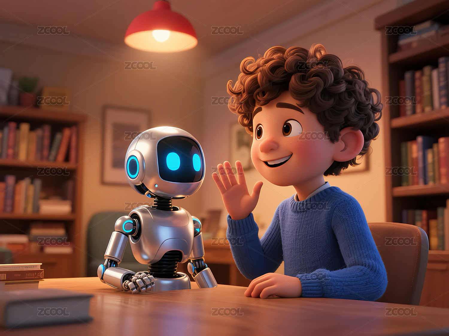 人物,男孩,背景,书房,室内,机器人,互动,人机交互,学习,三维