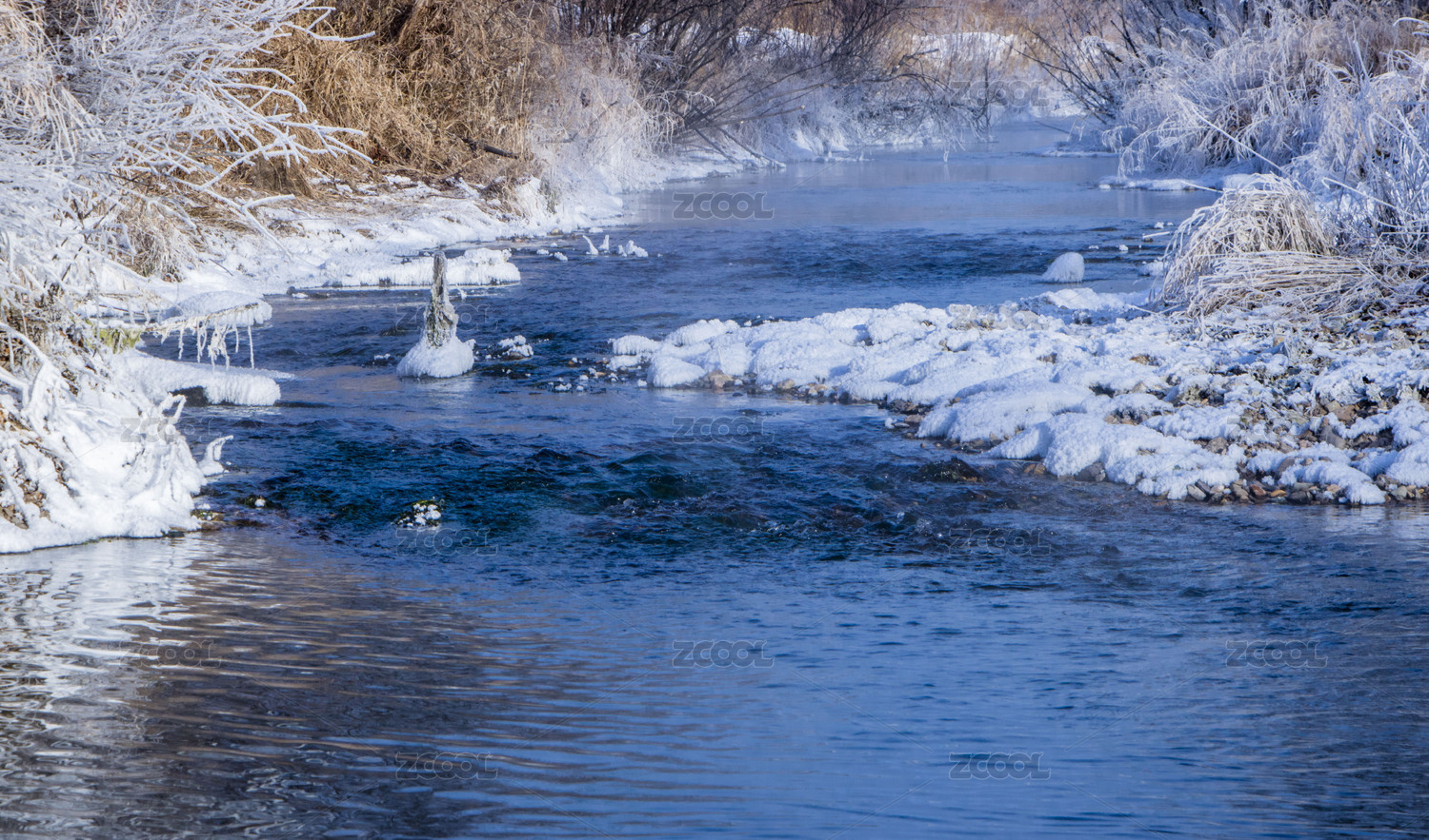中国东北冬季小溪积雪雪景