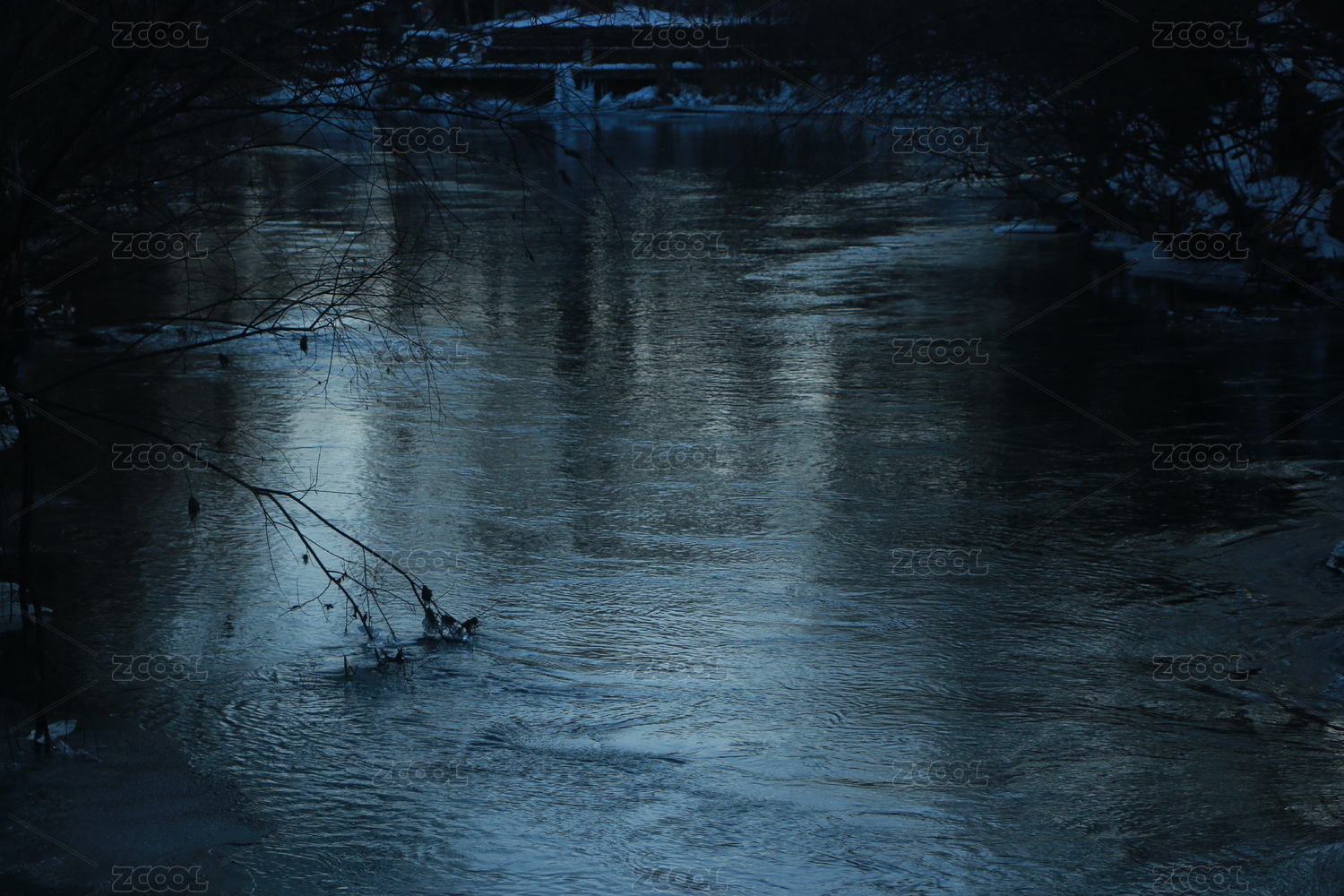 初冬积雪覆盖的山林和溪流