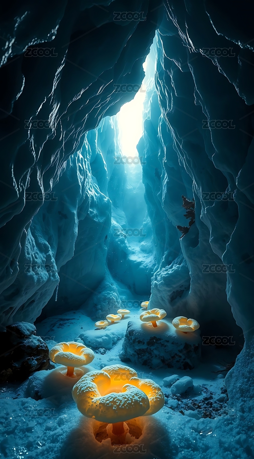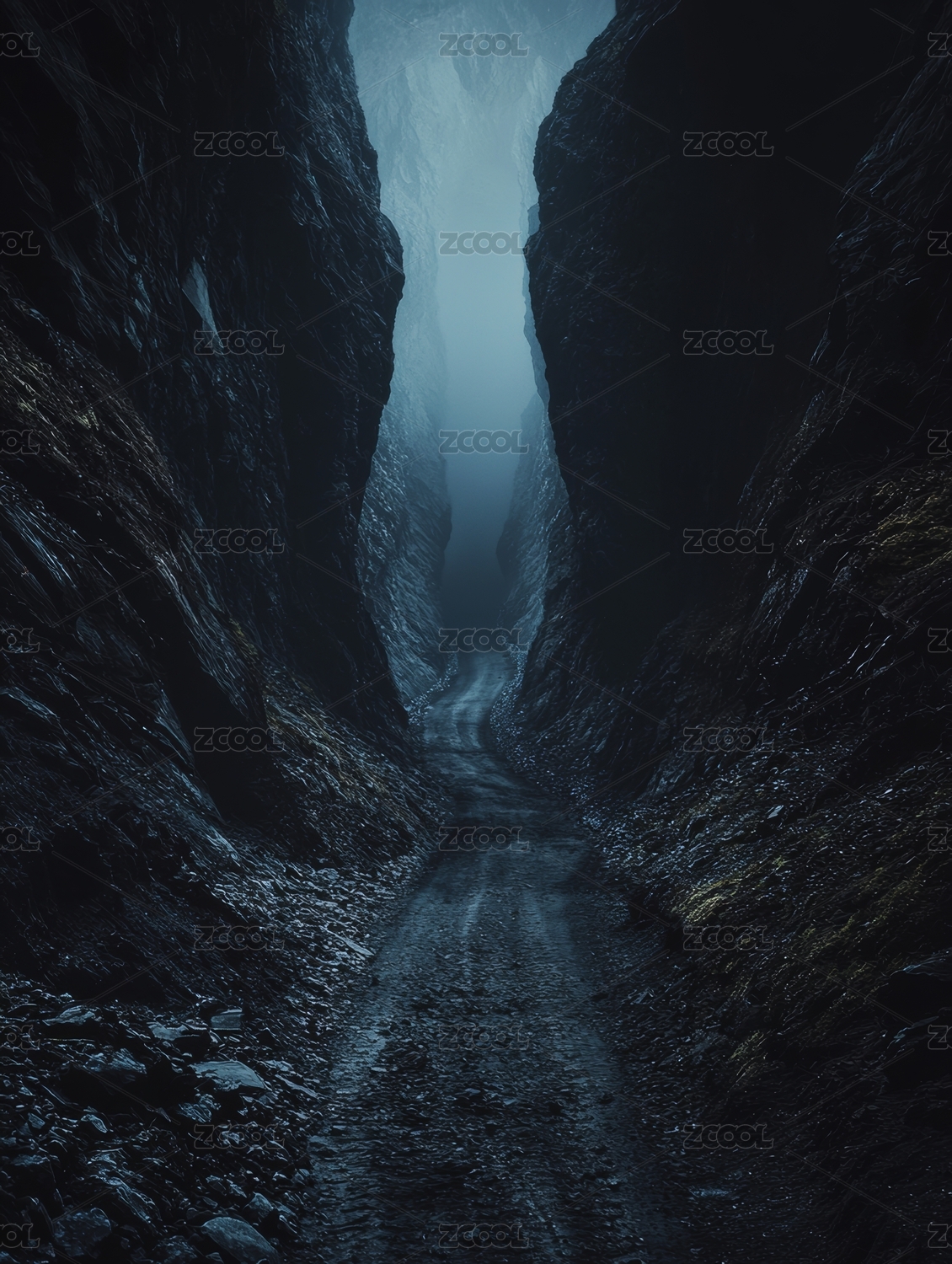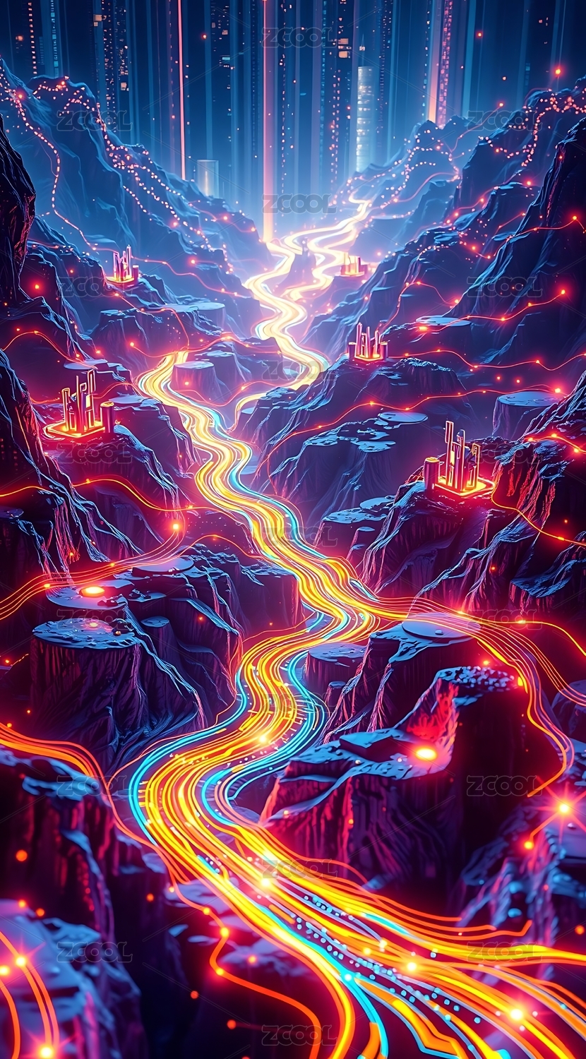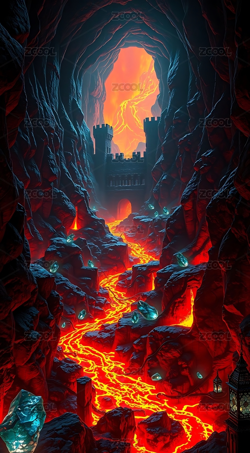 峡谷,熔岩,蓝色光束,发光颗粒,神秘氛围