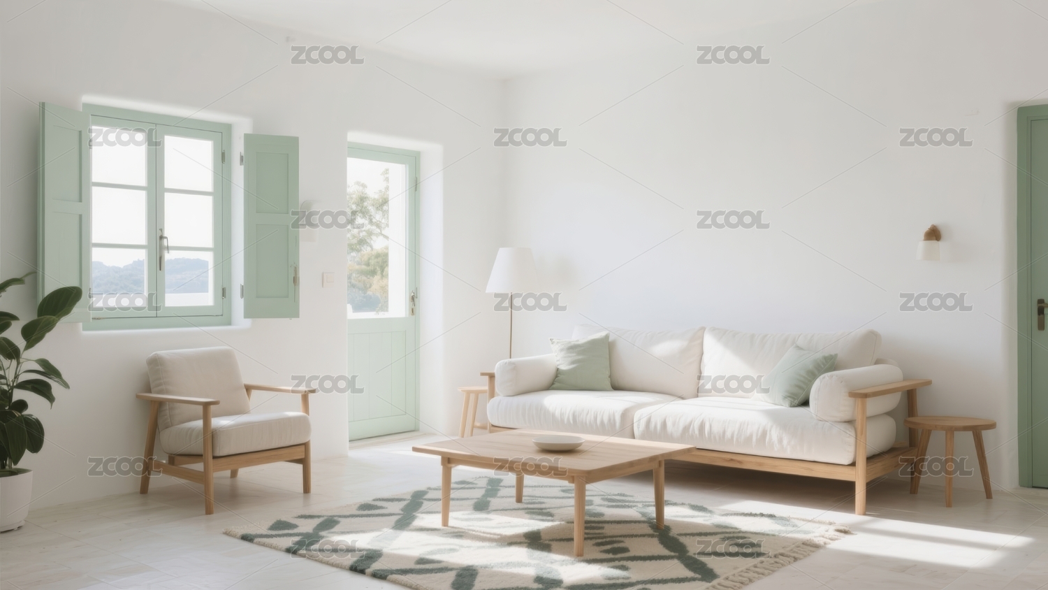 沙发,绿色,简约,花束,自然光,靠垫,米色,边桌,窗帘,装饰画