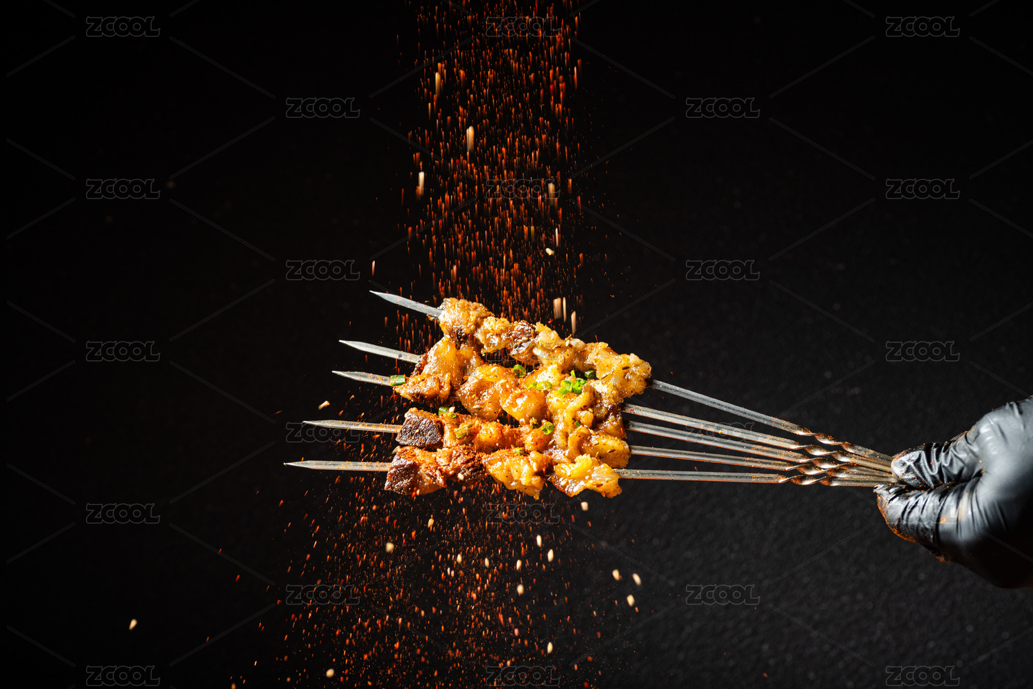 烧烤,烤串,暗色调,黑背景,撒辣椒面,黑手套,铁钎子