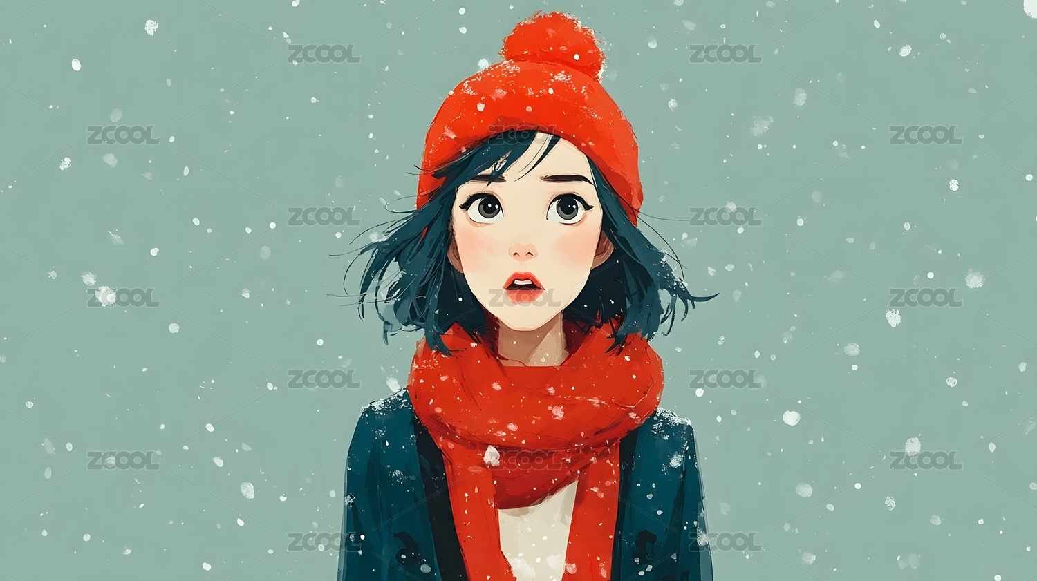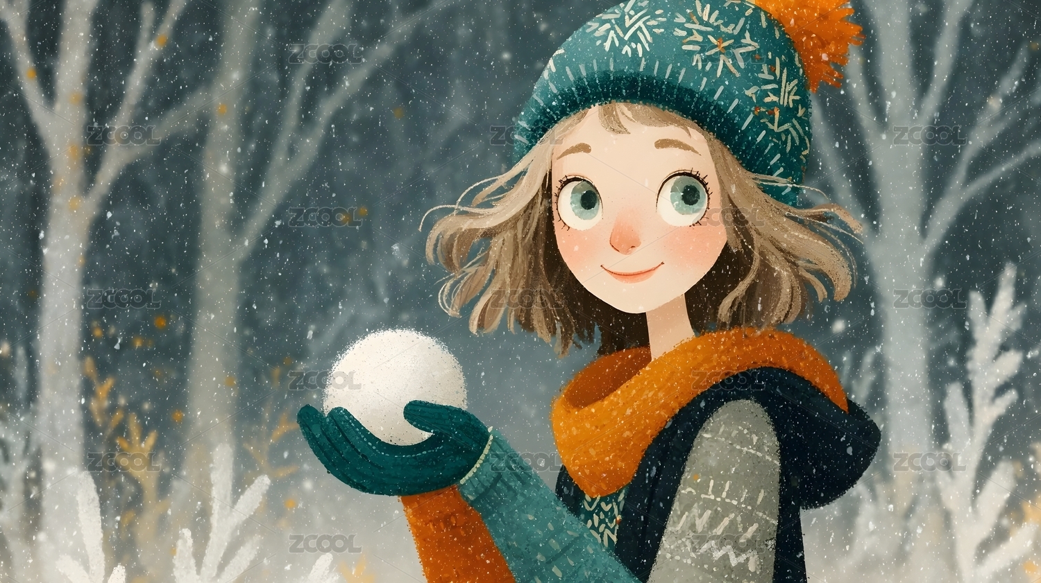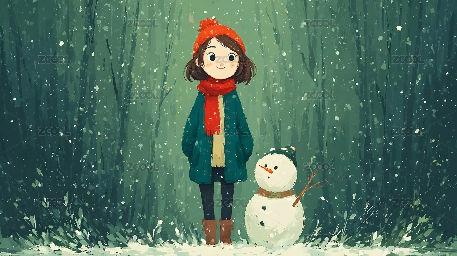 绿色,背景,橙色,冬季,女孩,雪人,雪,围巾,帽子,冬天