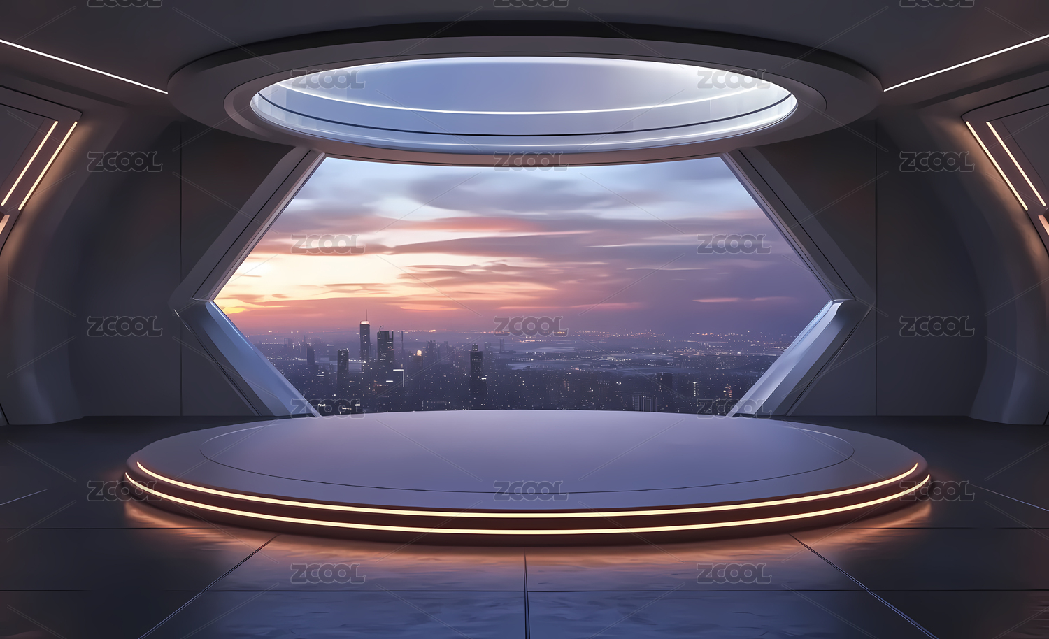 圆形室内阳台与城市天际线产品展台背景