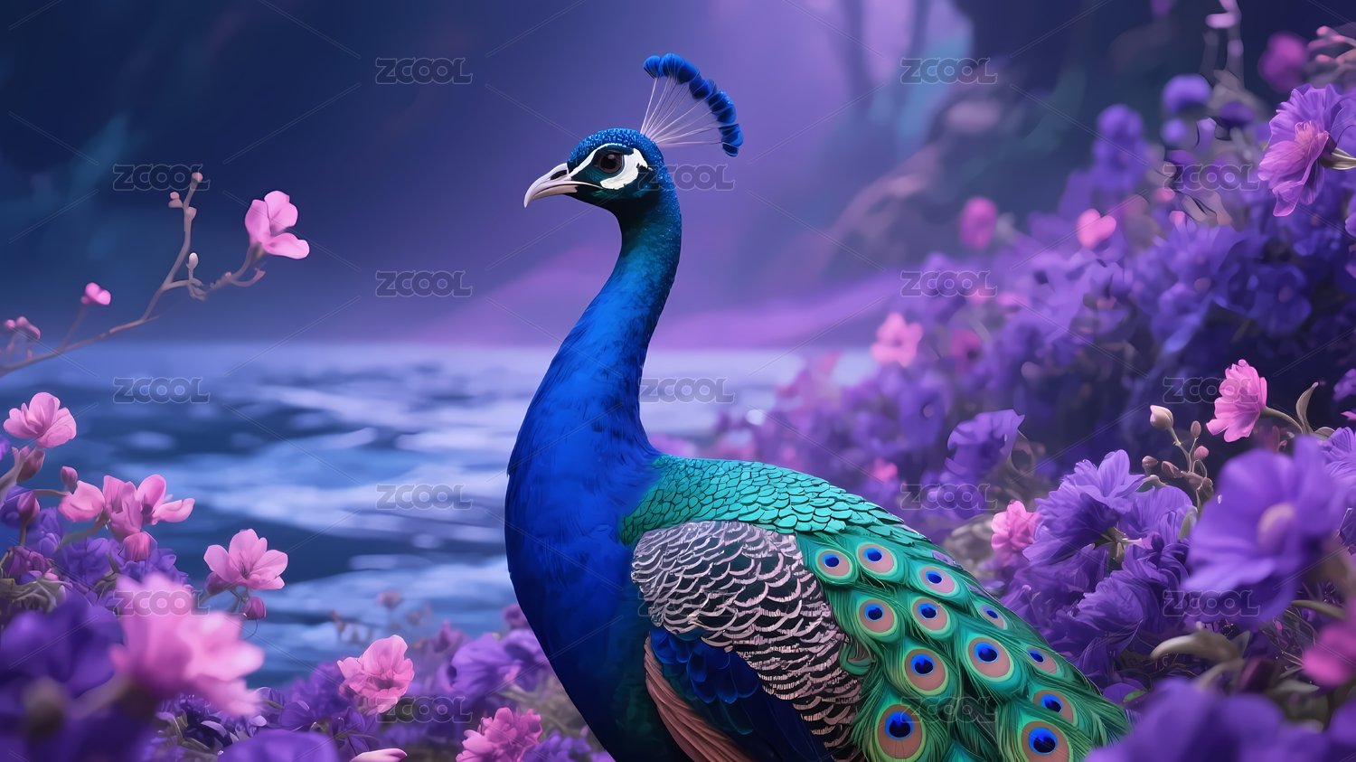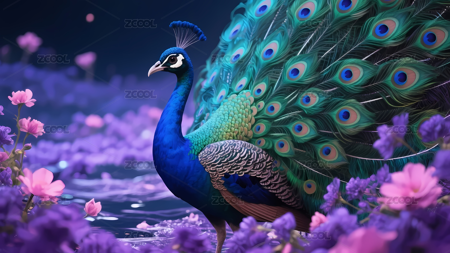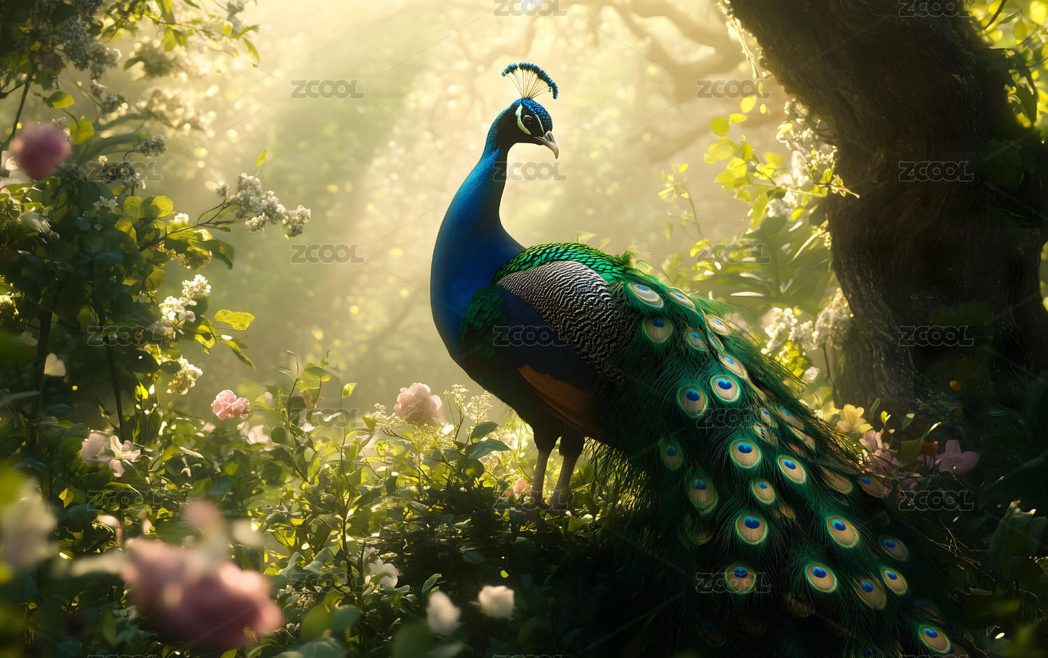 蓝绿孔雀与花丛
