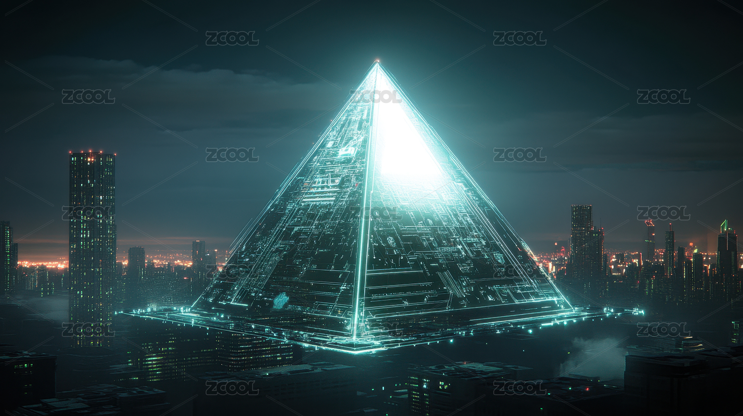 未来城市中的发光金字塔