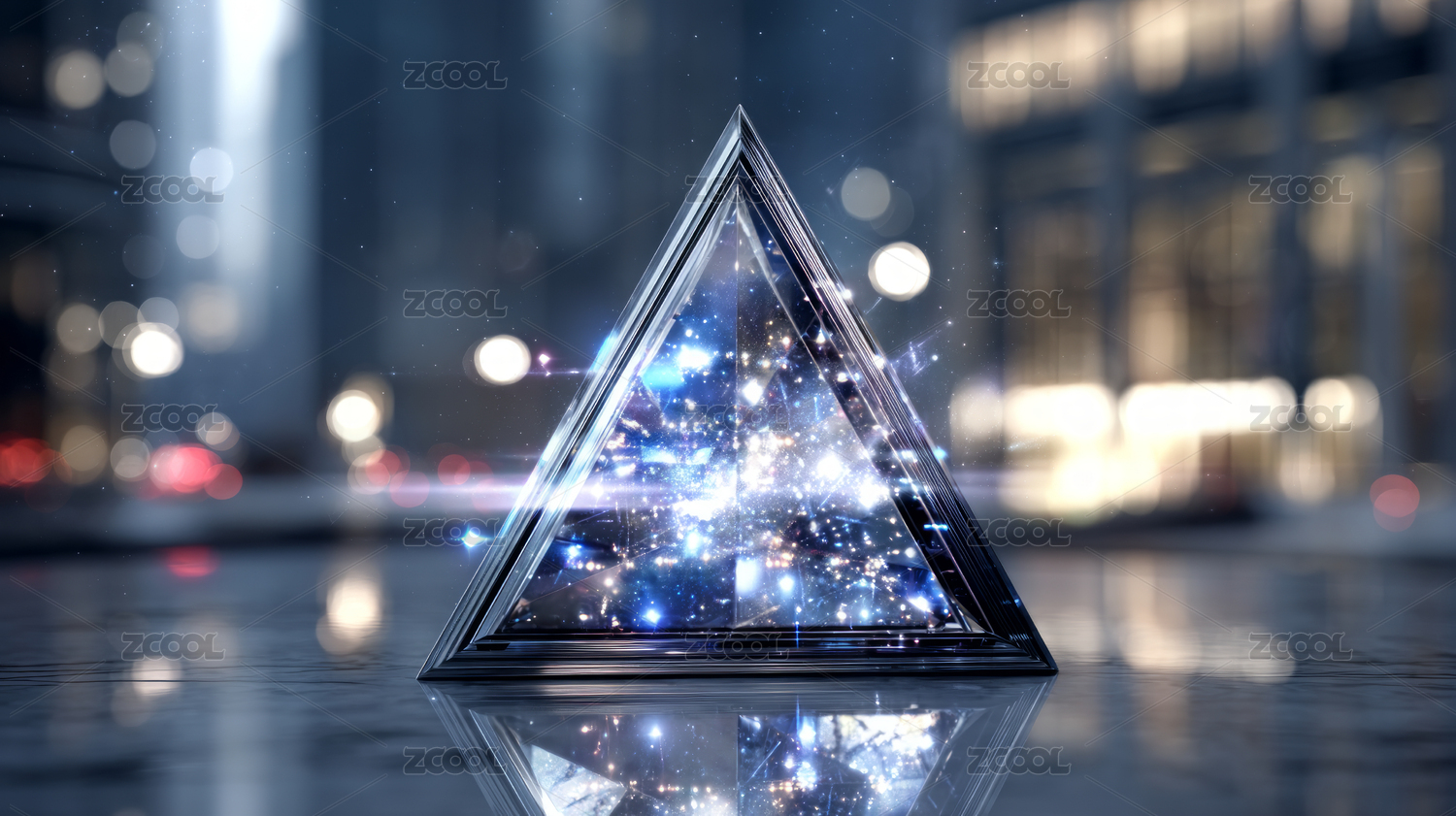 城市夜景中的发光粒子玻璃金字塔