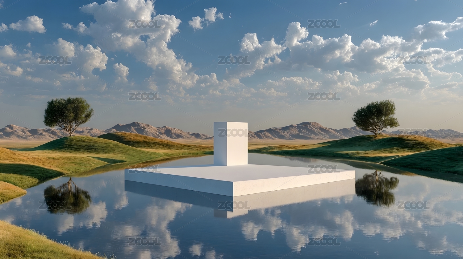 绿丘静水中的白色平台
