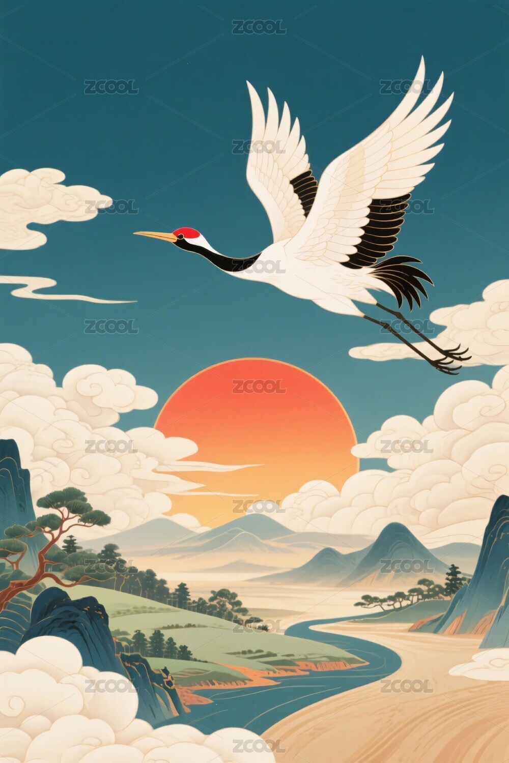丹顶鹤山水插画