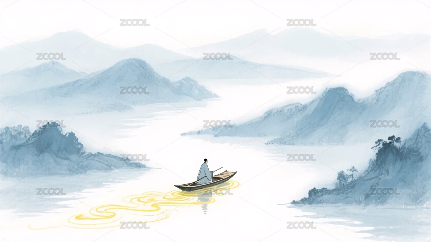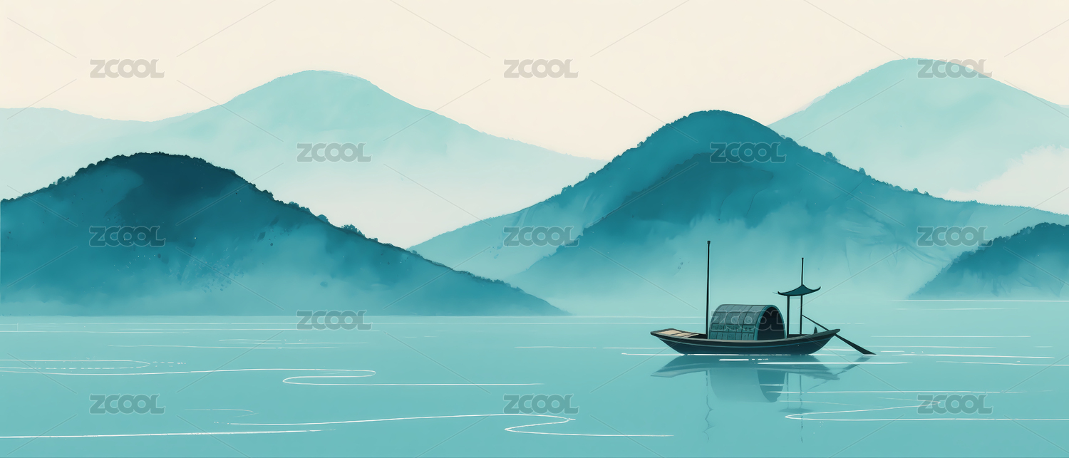 孤舟,山水,江面,山峰,云雾,插画,自然,风景,宁静,写意