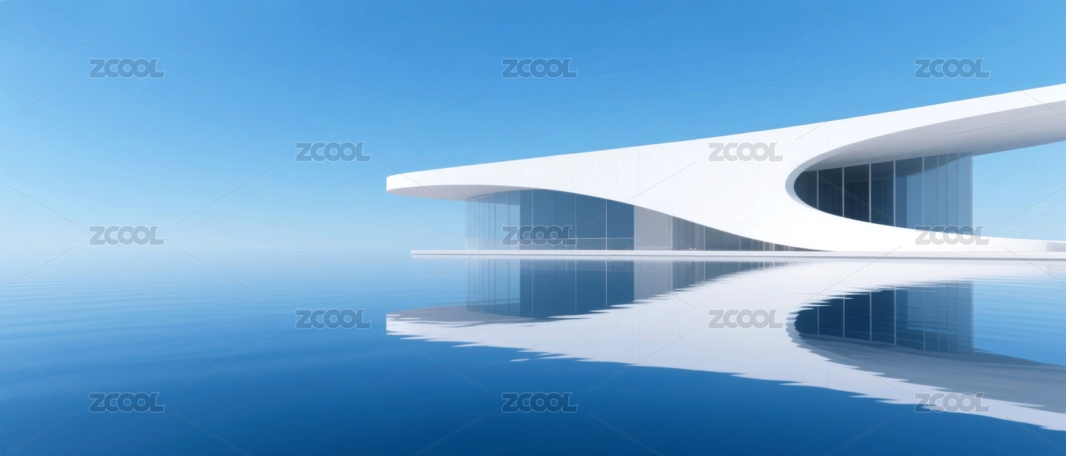 现代流线型建筑与水景倒影