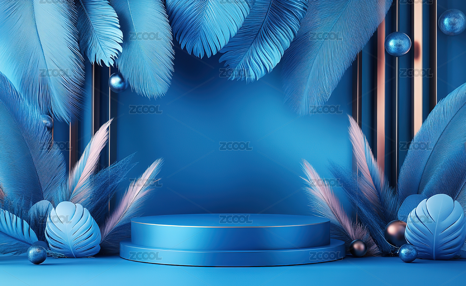 蓝色背景下的白色植物与圆形展台