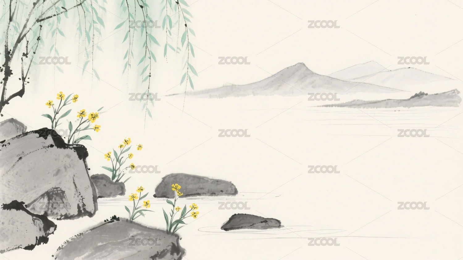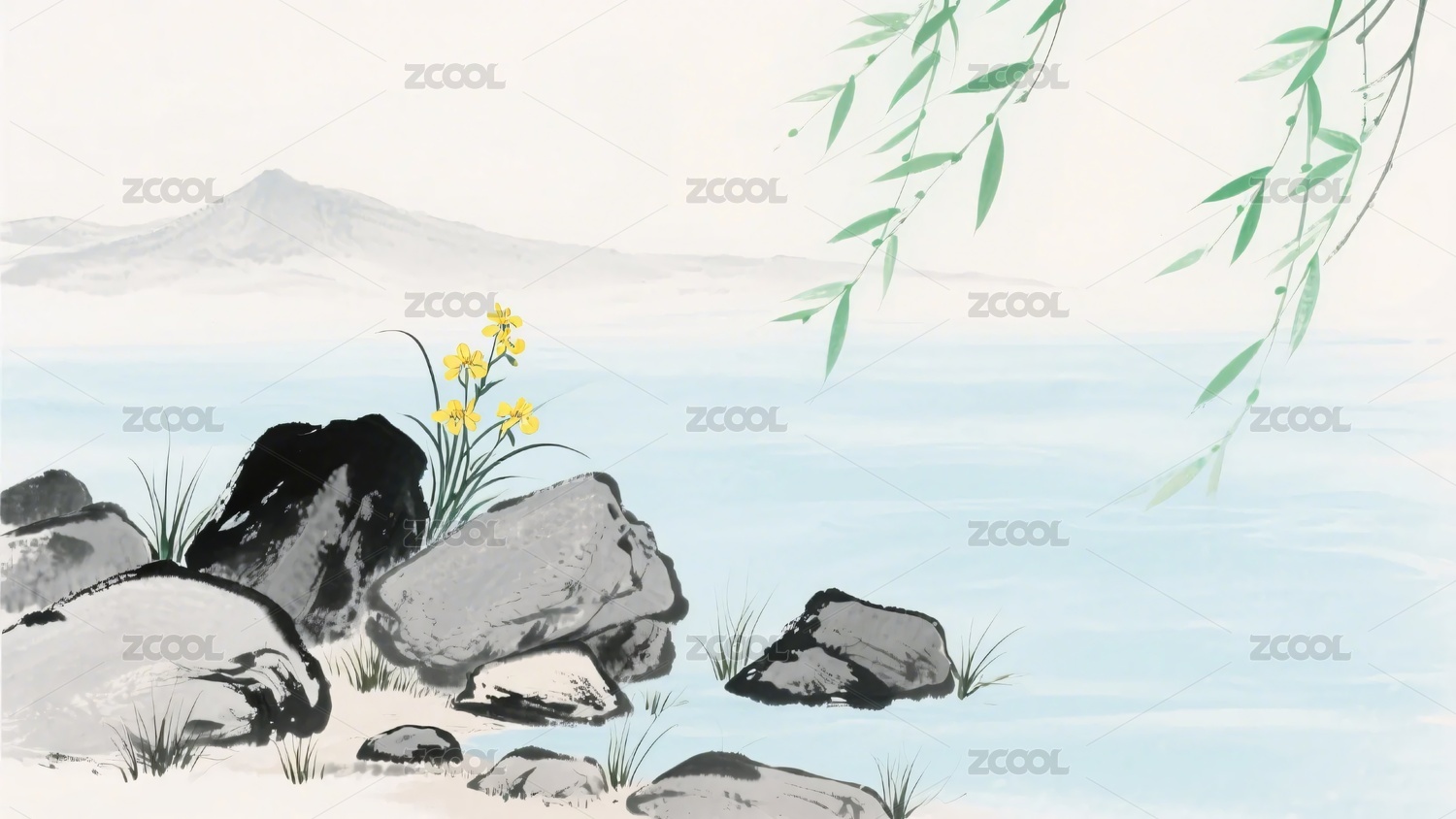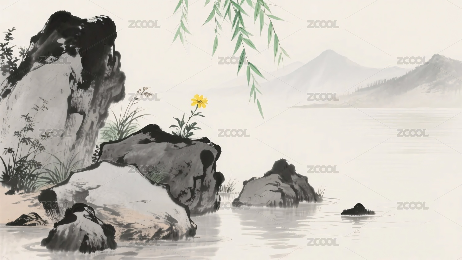 山水,岩石,花朵,柳枝,水墨画,插画,风景,自然,中国风,元素