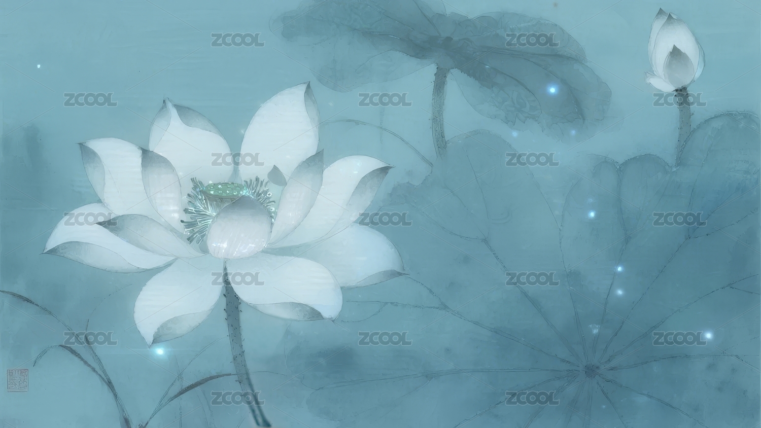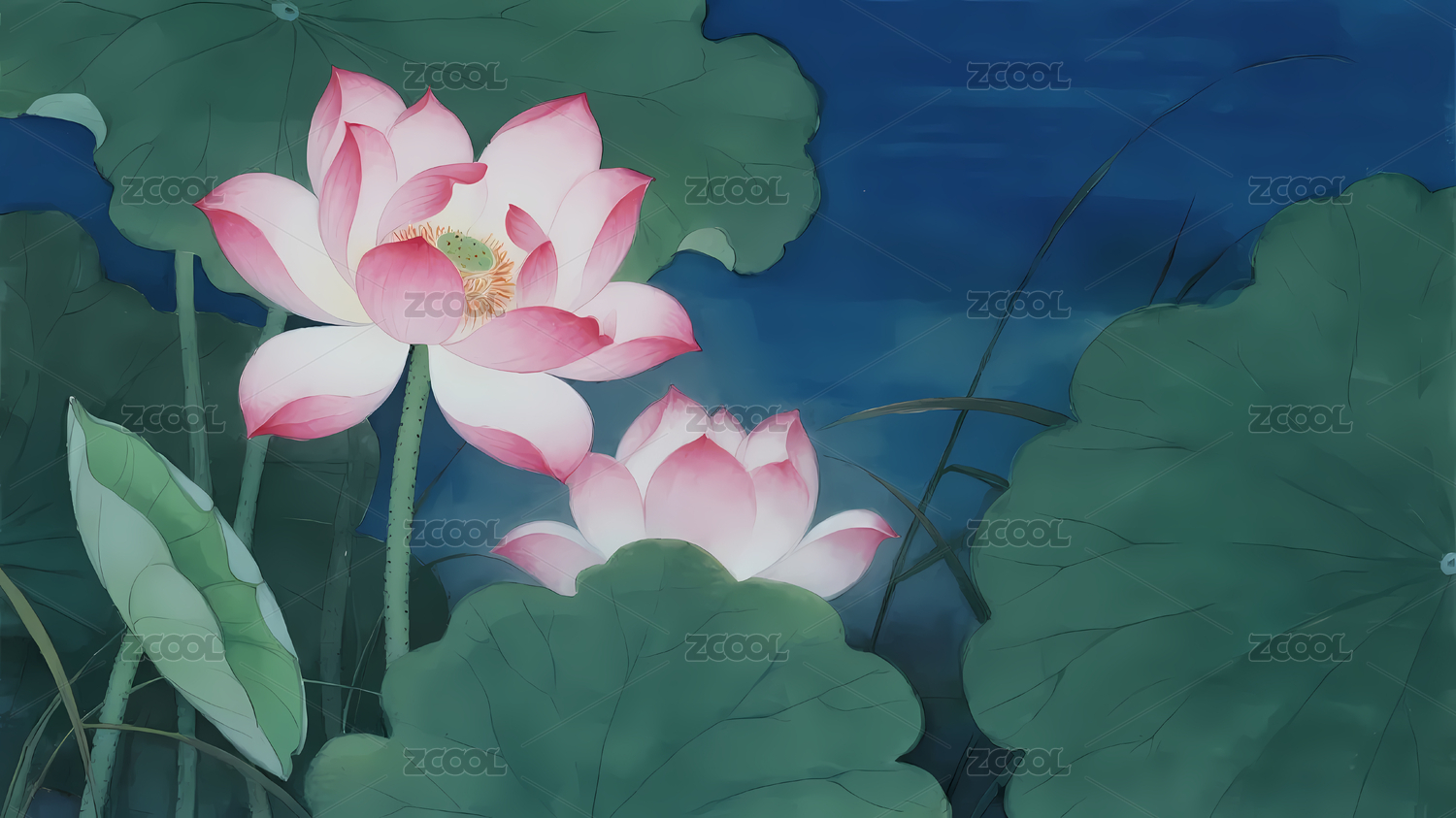 蓝色调中的莲花与荷叶