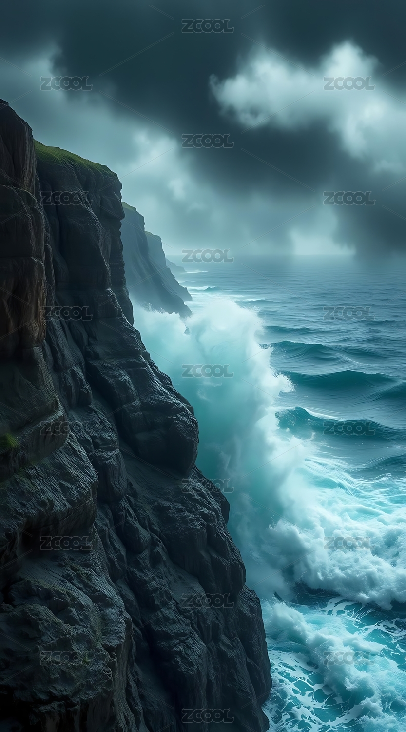 海岸悬崖瀑布与海浪交织的壮丽景色