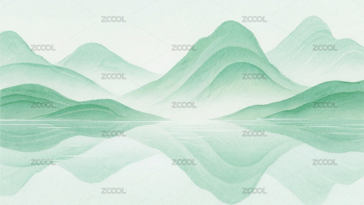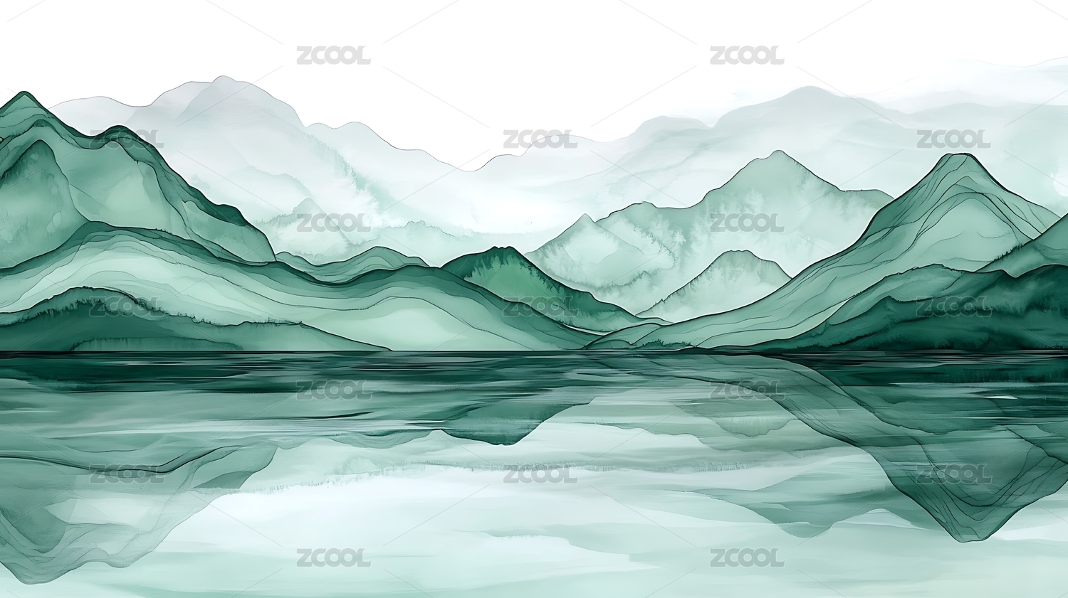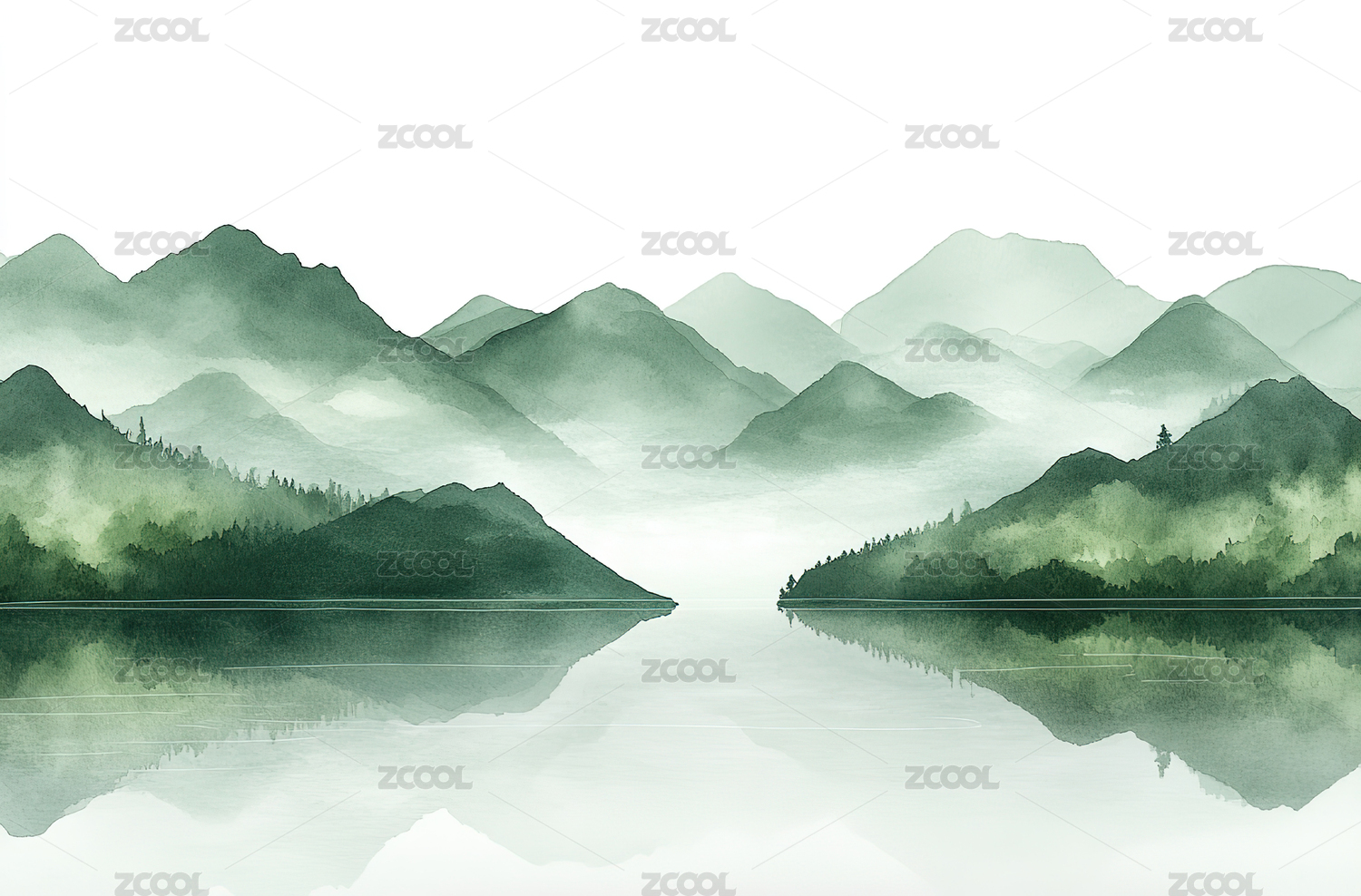 山水,倒影,插画,水墨风,自然,风景,绿色,平静,湖面,元素