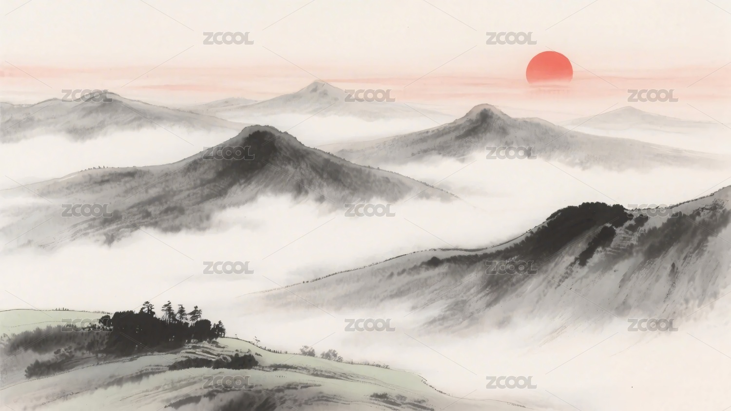 山水,日出,云雾,插画,风景,自然,中式,水墨,意境,元素