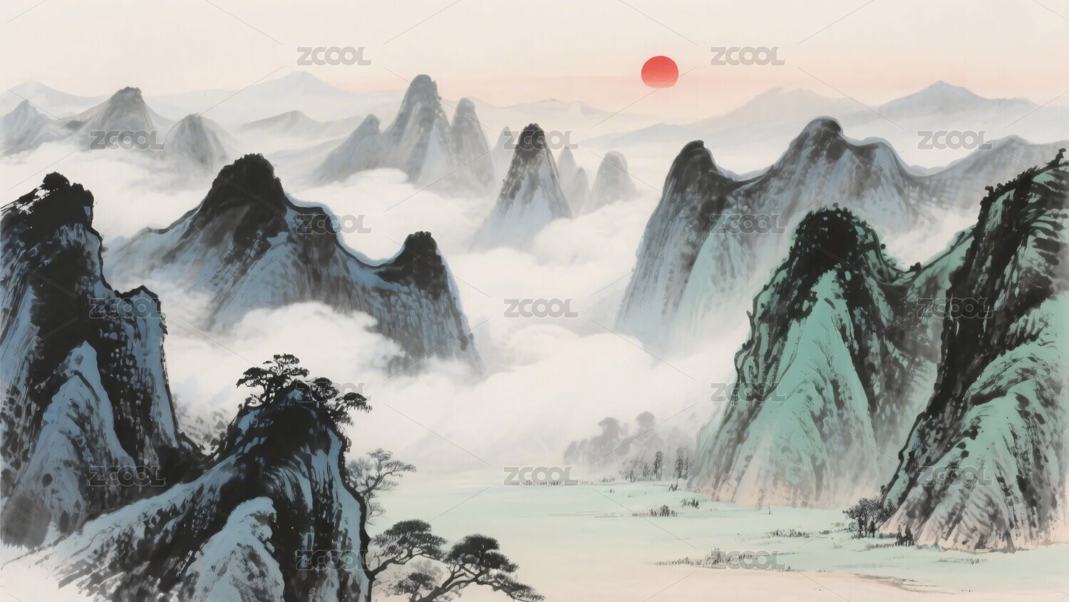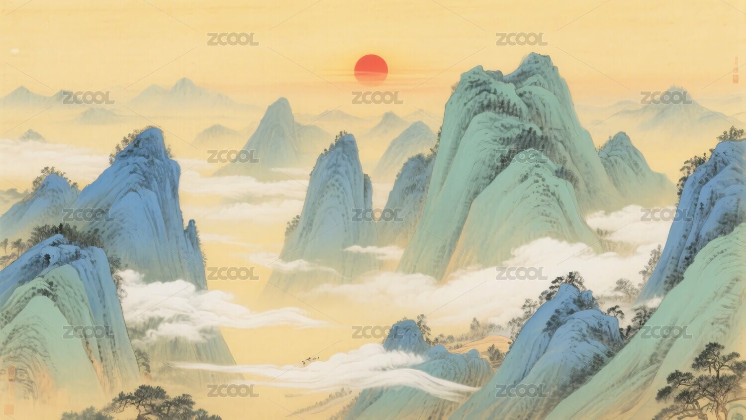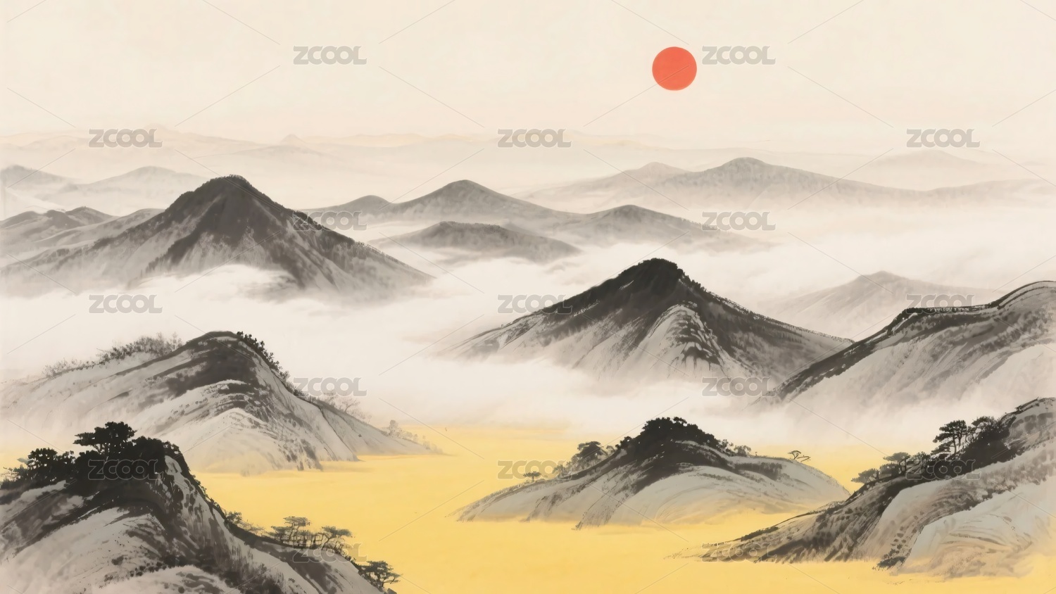山水,日出,云雾,树木,插画,风景,中式,水墨画,意境,自然