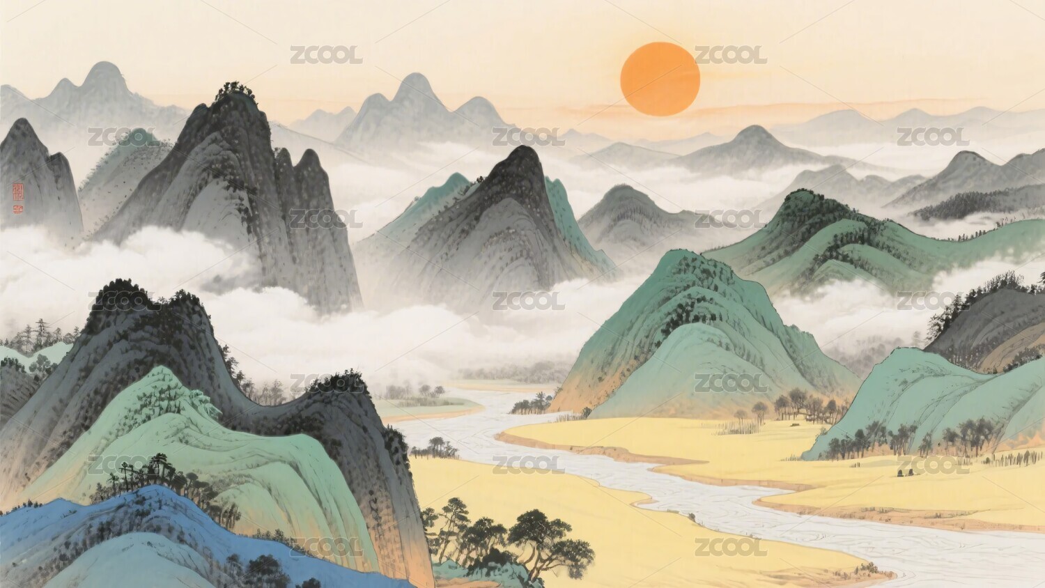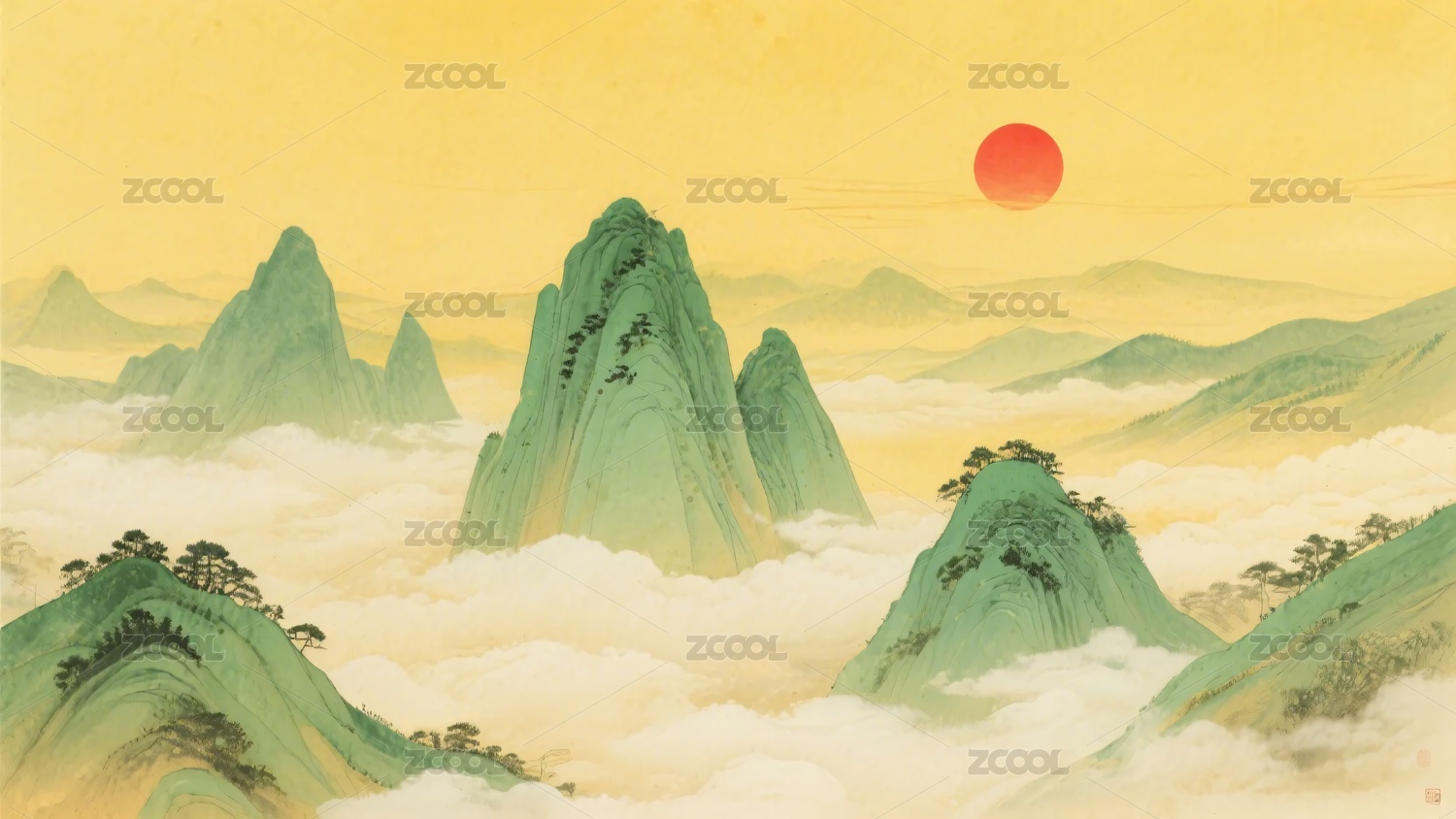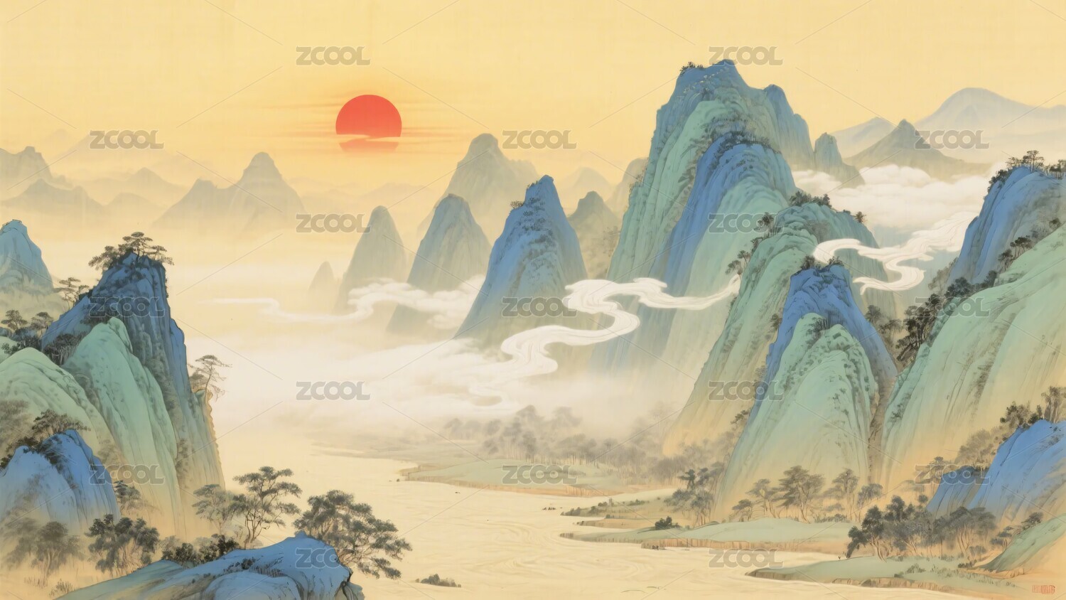 山水,日出,云雾,树木,插画,风景,中式,水墨画,意境,自然