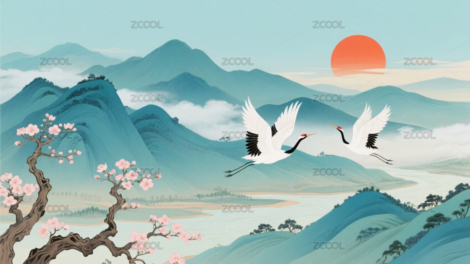山水,太阳,樱花树,插画,自然,风景,飞翔,天空,云朵,山脉
