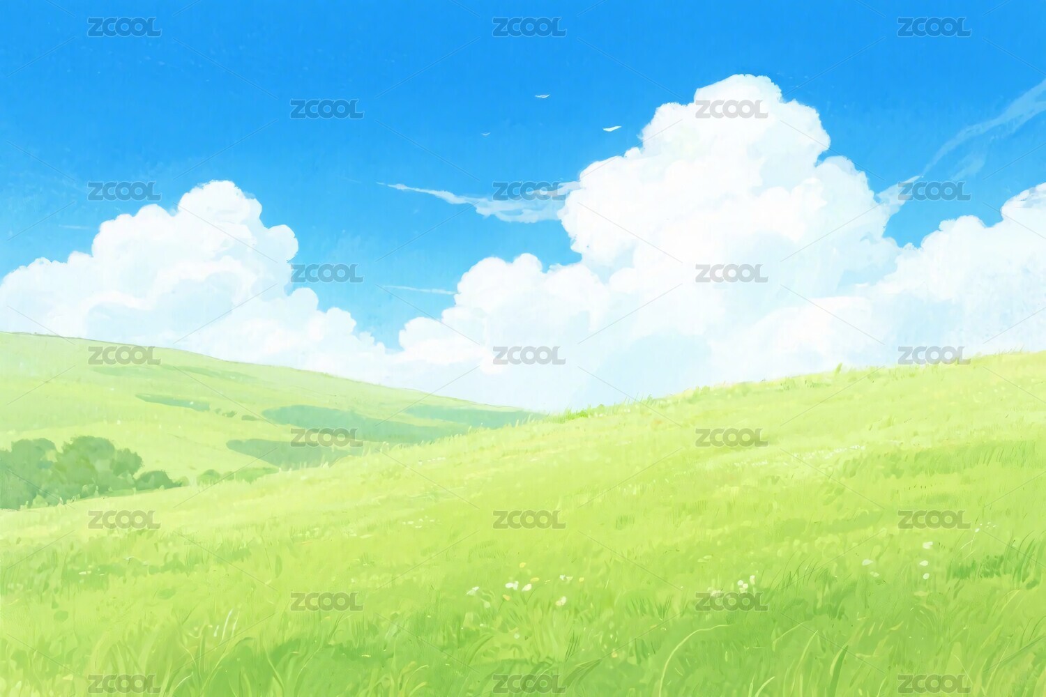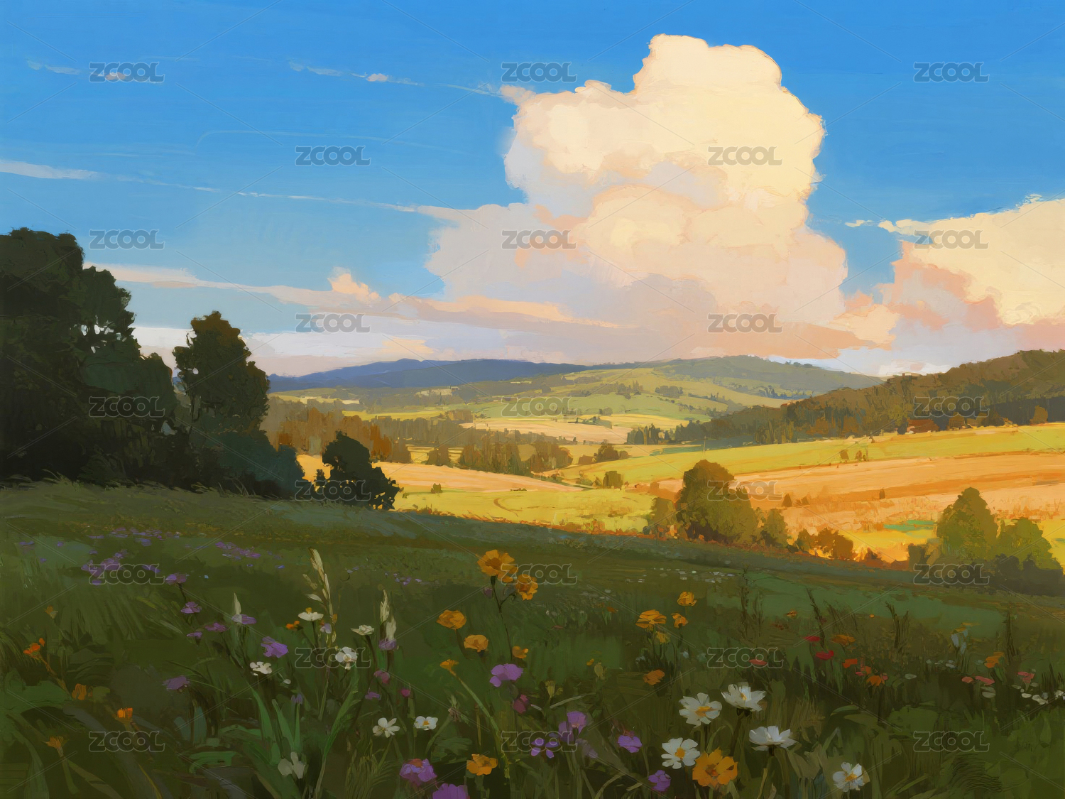 油画质感夏日山坡草地鲜花蓝天白云风景背景