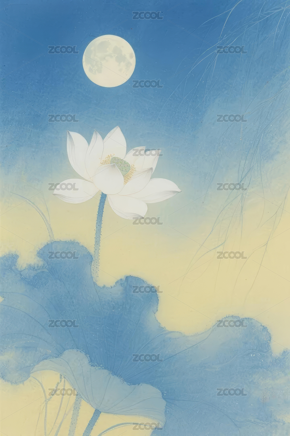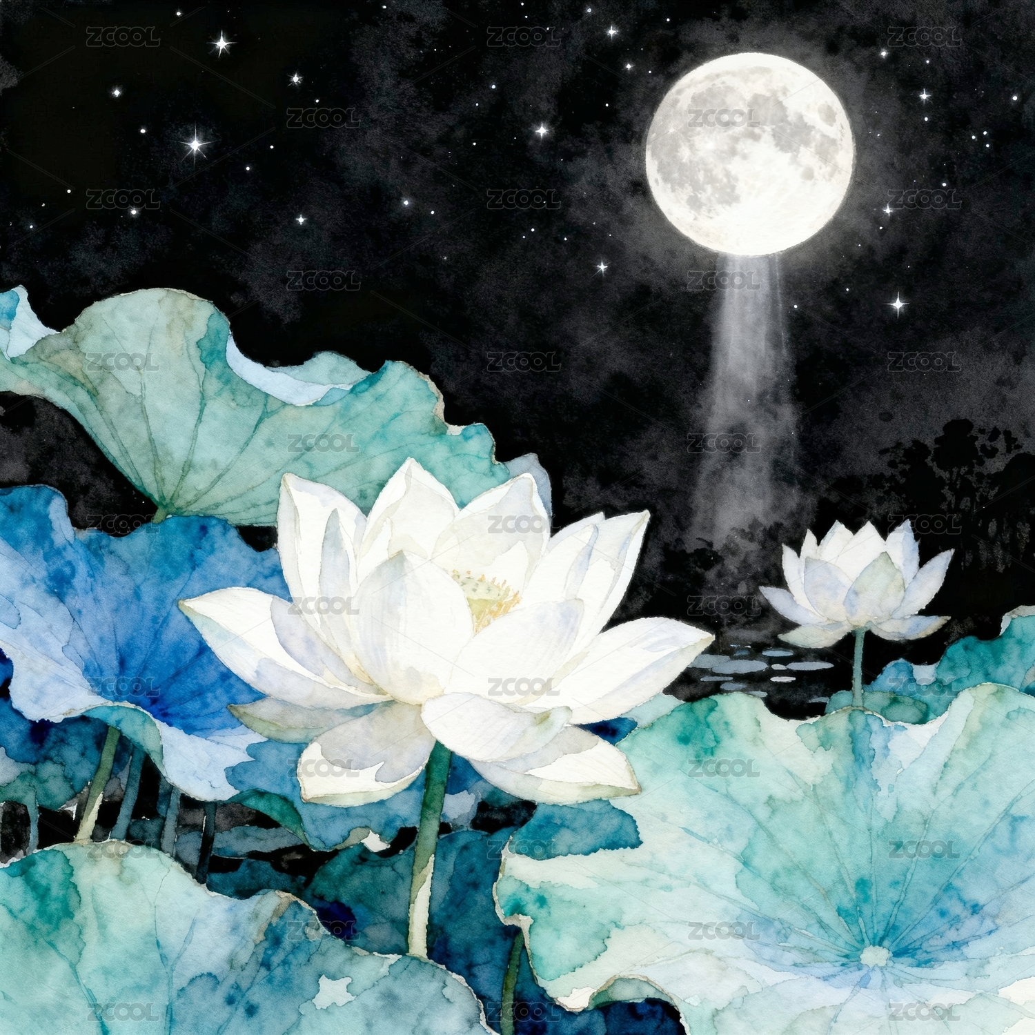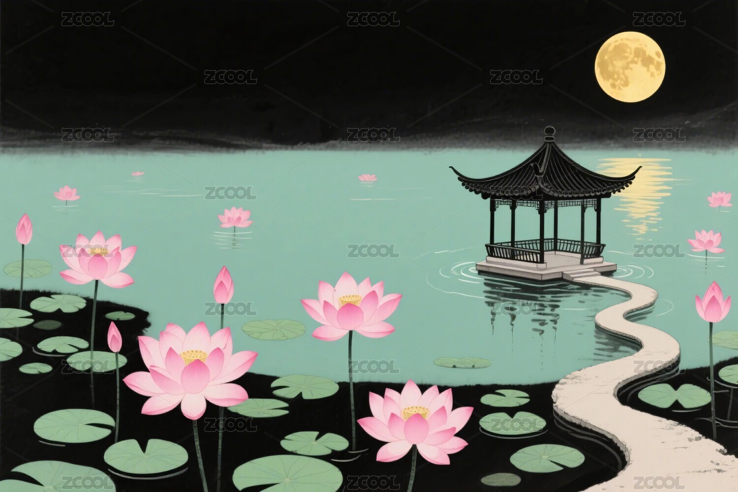 荷花,月亮,青蛙,荷叶,萤火虫,夜晚,水面,自然,艺术