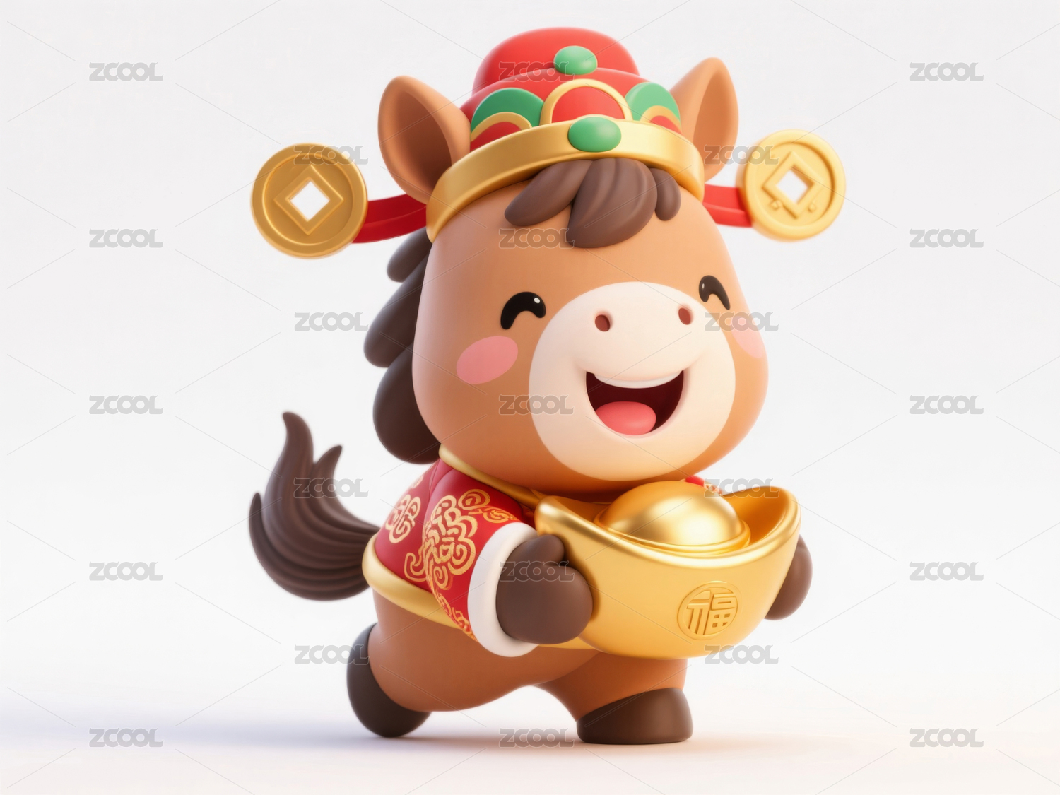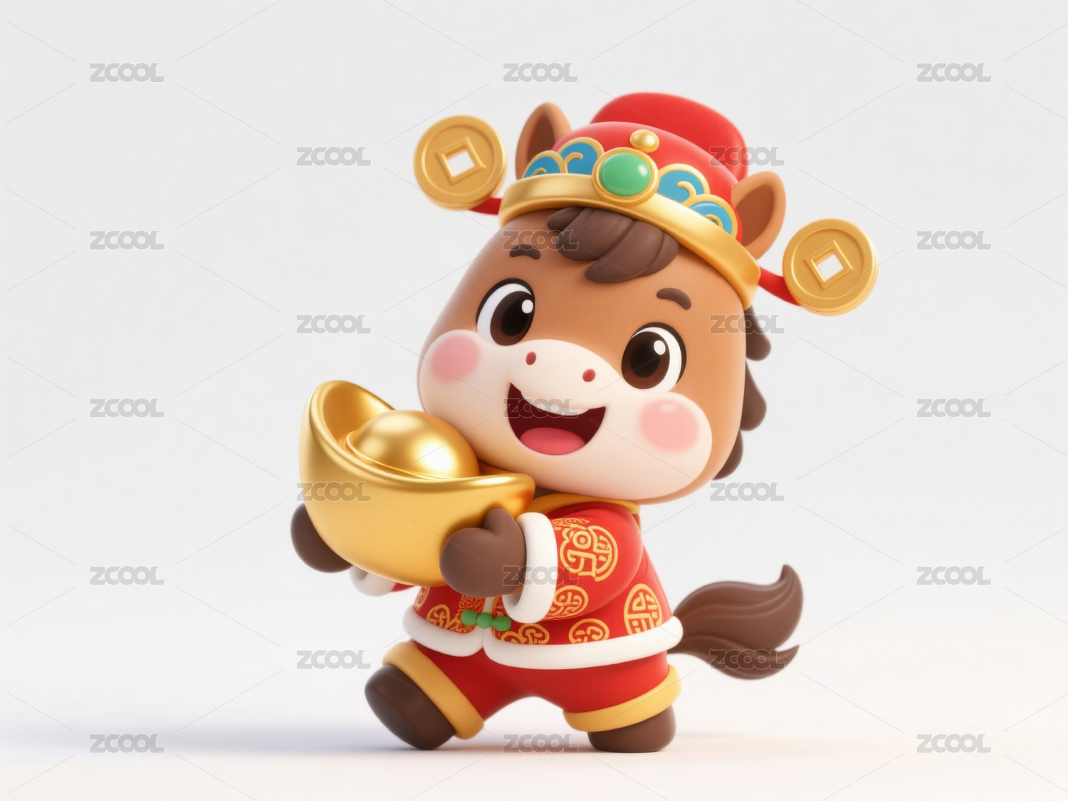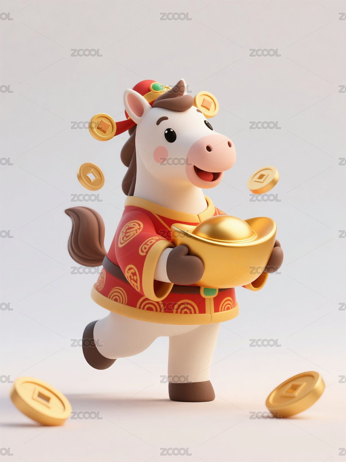 新年,小马,福气,金币,红色,服饰,卡通,节日,可爱