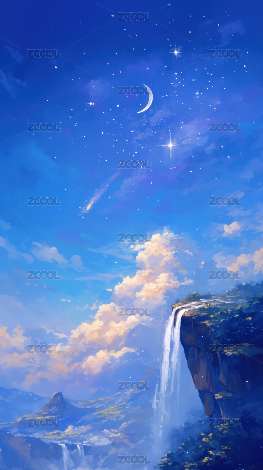 夜景风光唯美瀑布插画