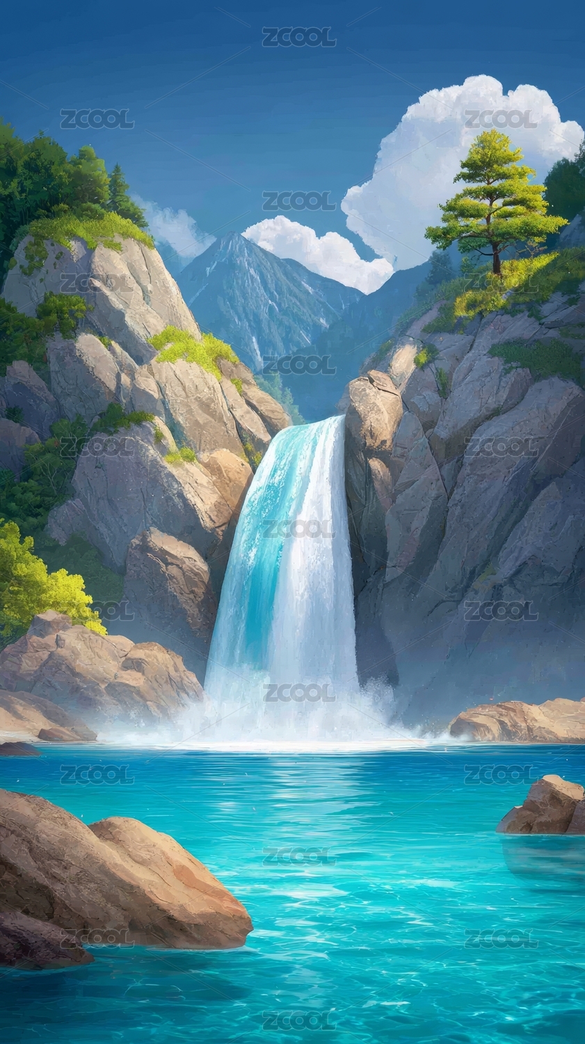 瀑布自然风光插画