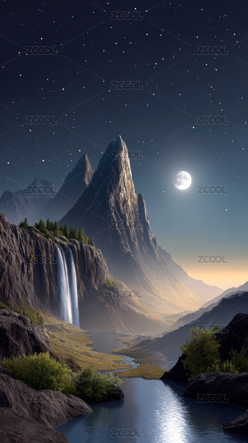 月夜山川瀑布星空