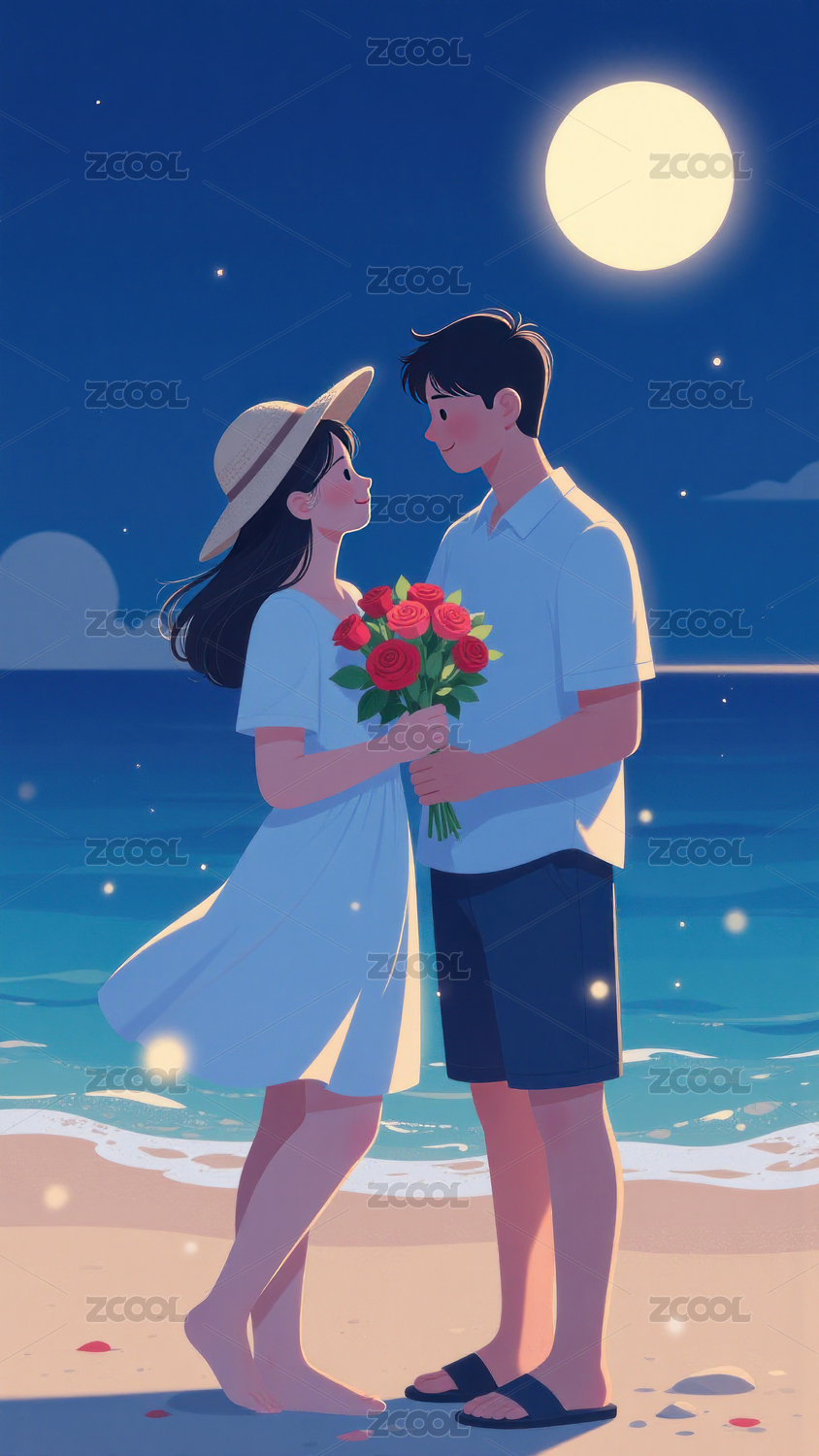 海边情侣的甜蜜夜晚七夕情人节浪漫约会