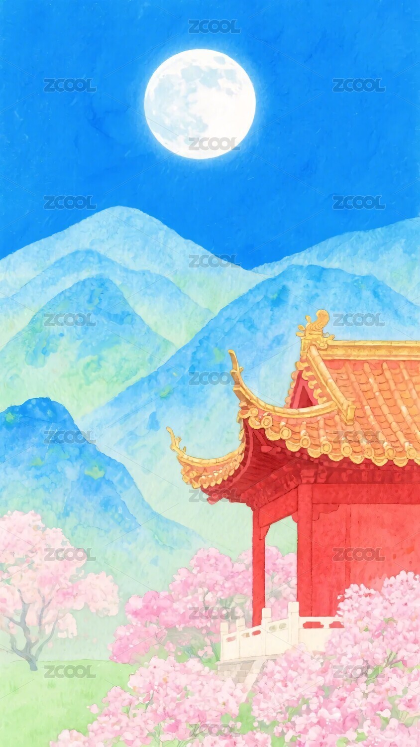 古建山水月夜插画