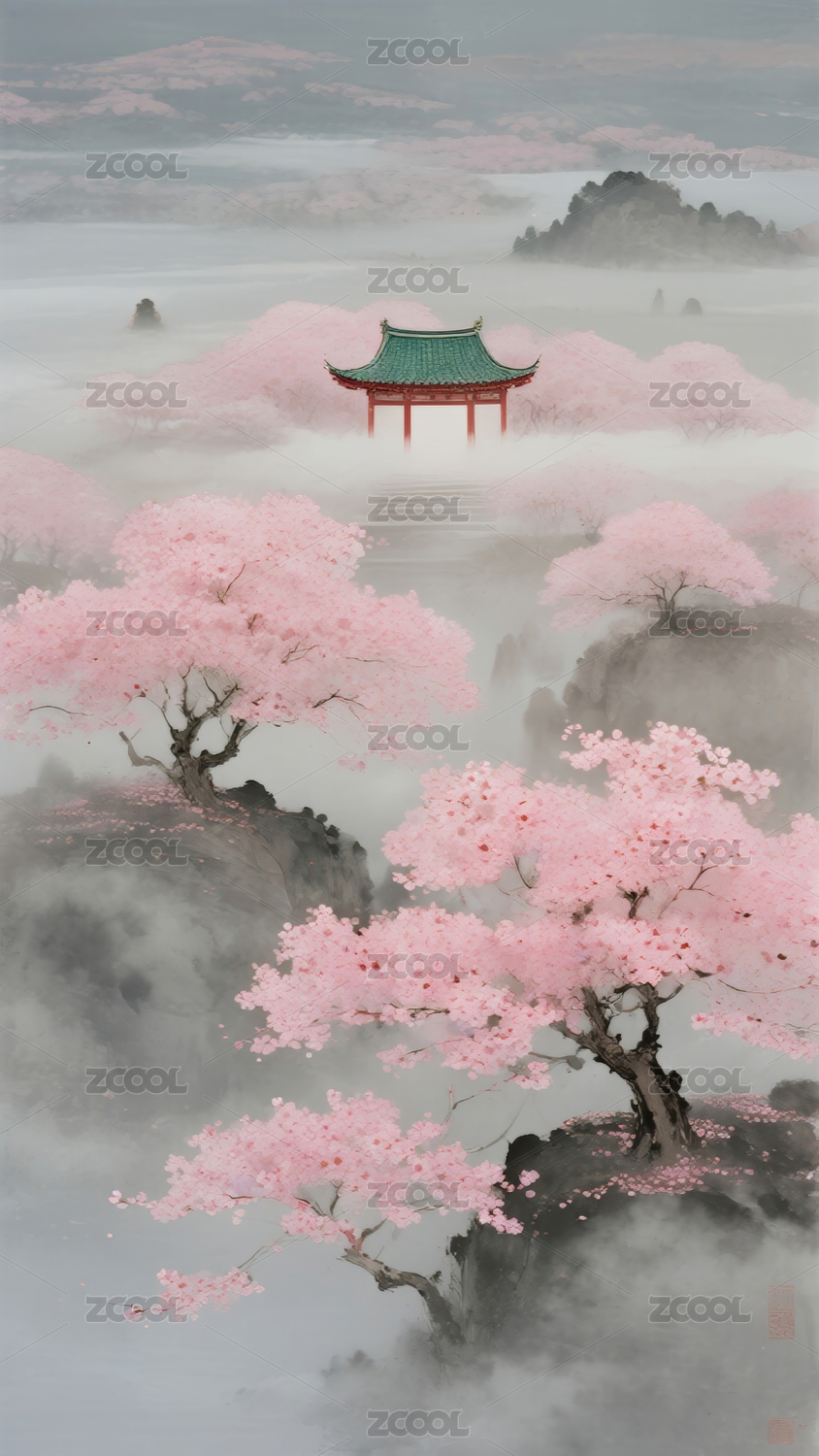 古风山水樱花建筑插画