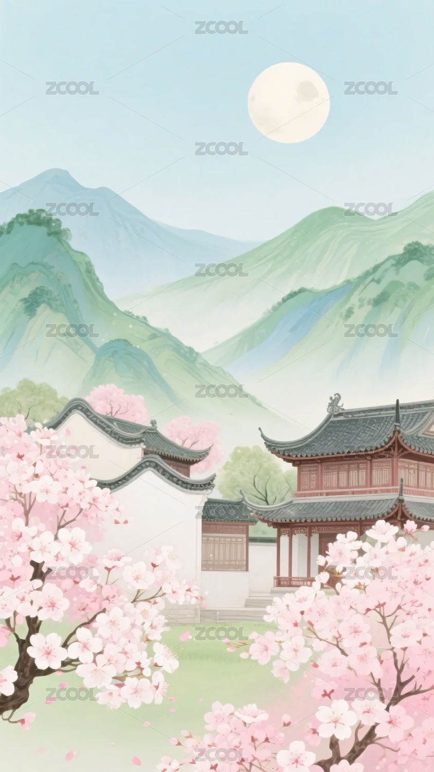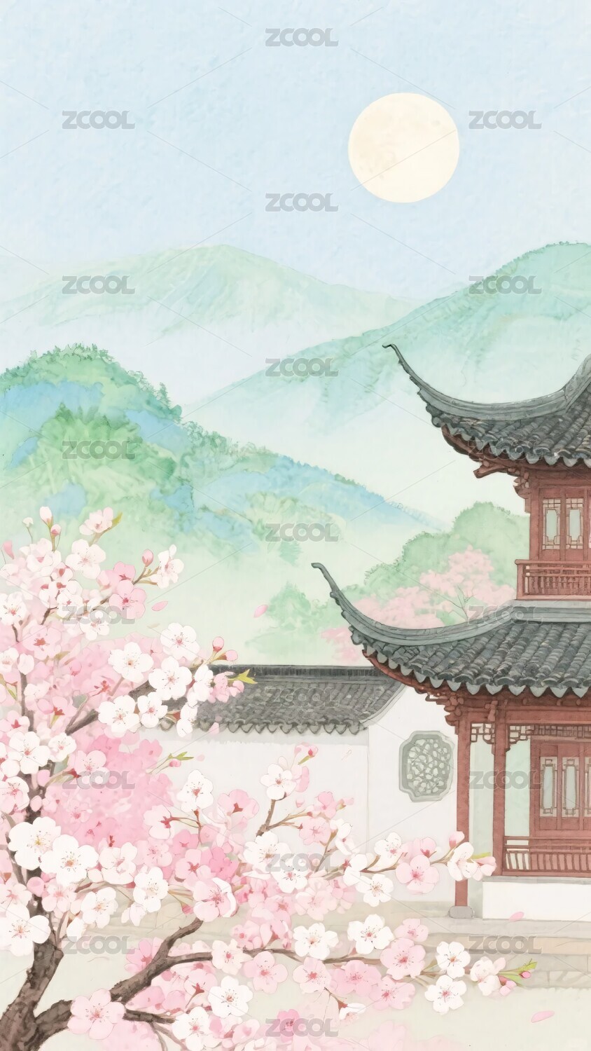 古风建筑与山水樱花插画