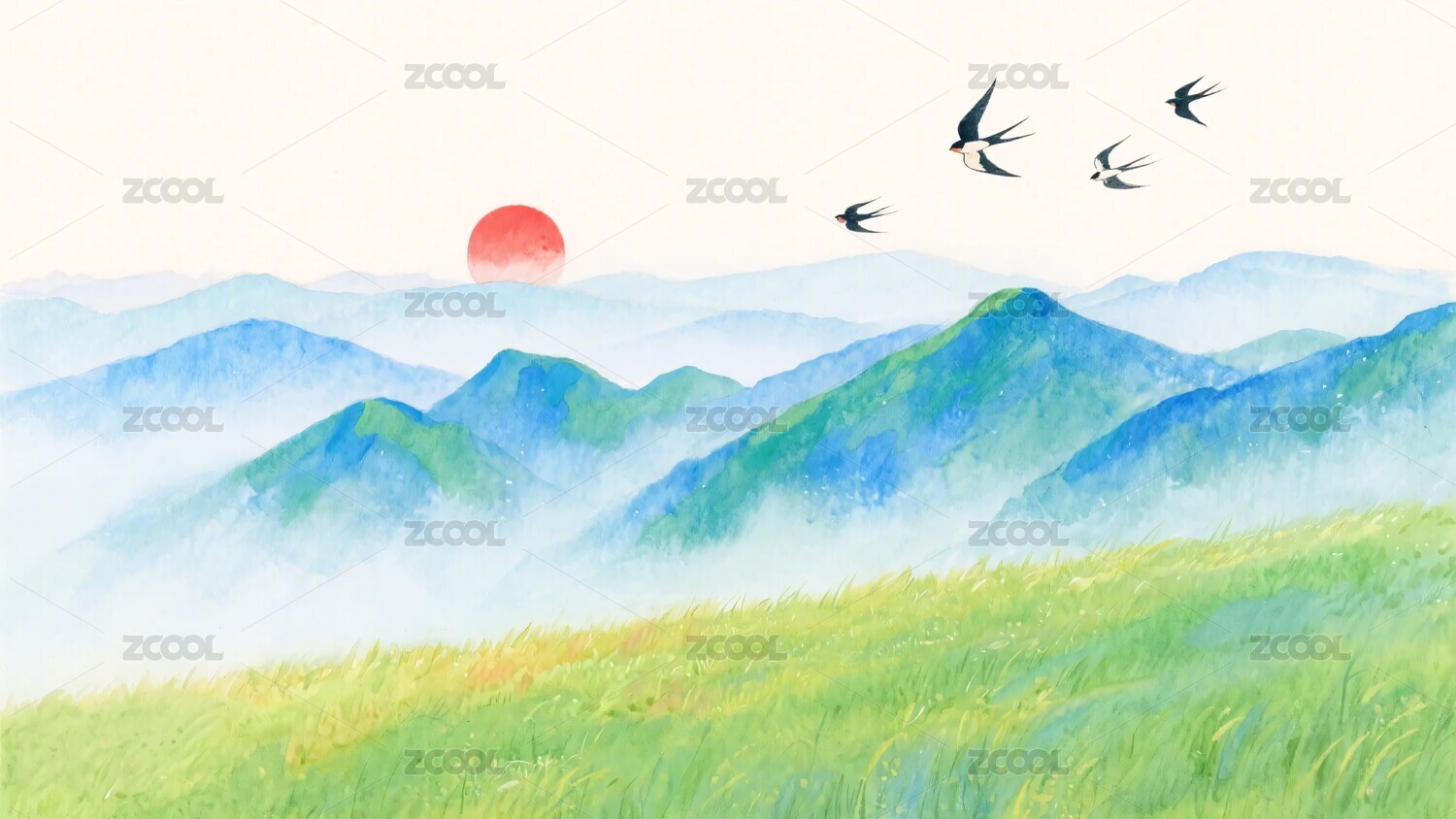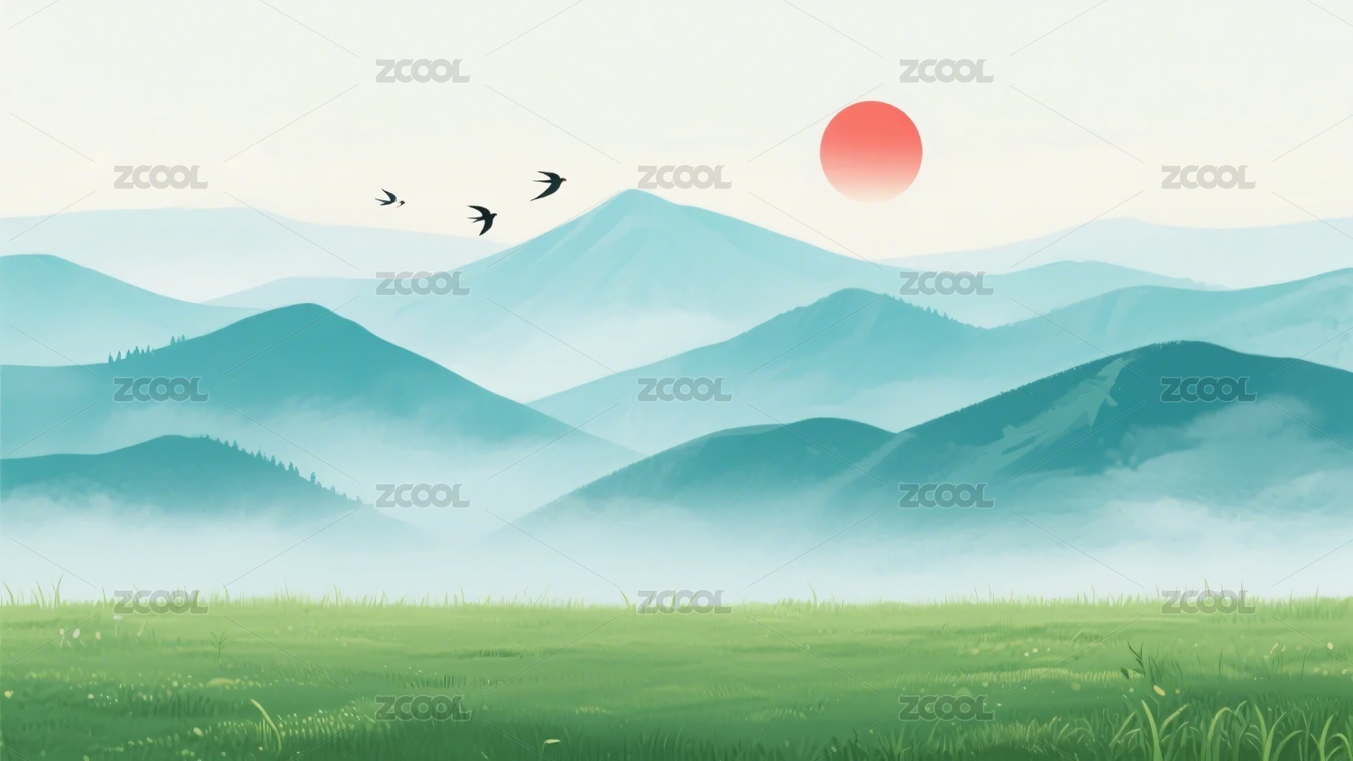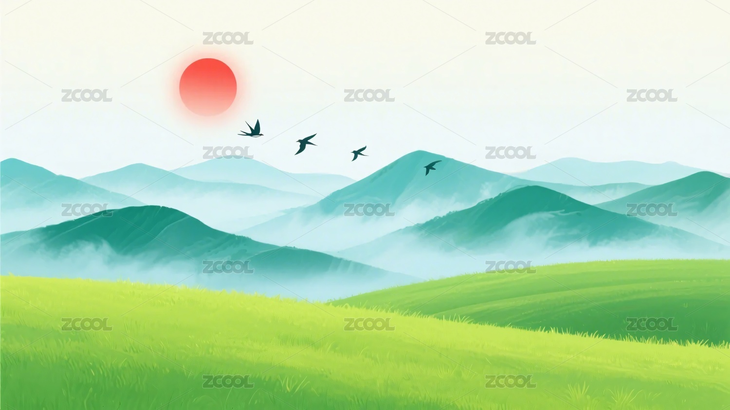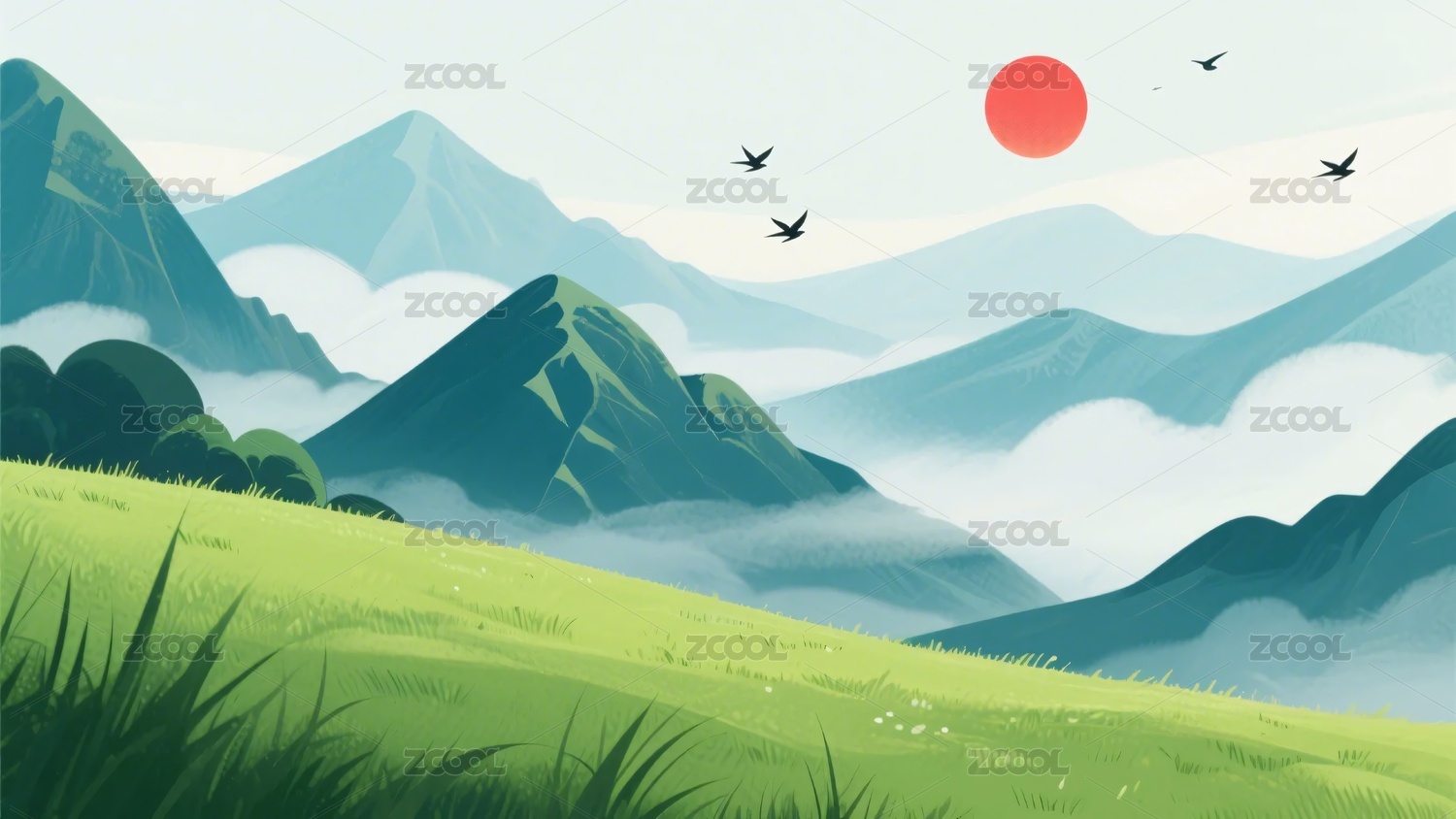 日出,飞鸟,草地,风景,插画,自然,清晨,天空,绿色,蓝色