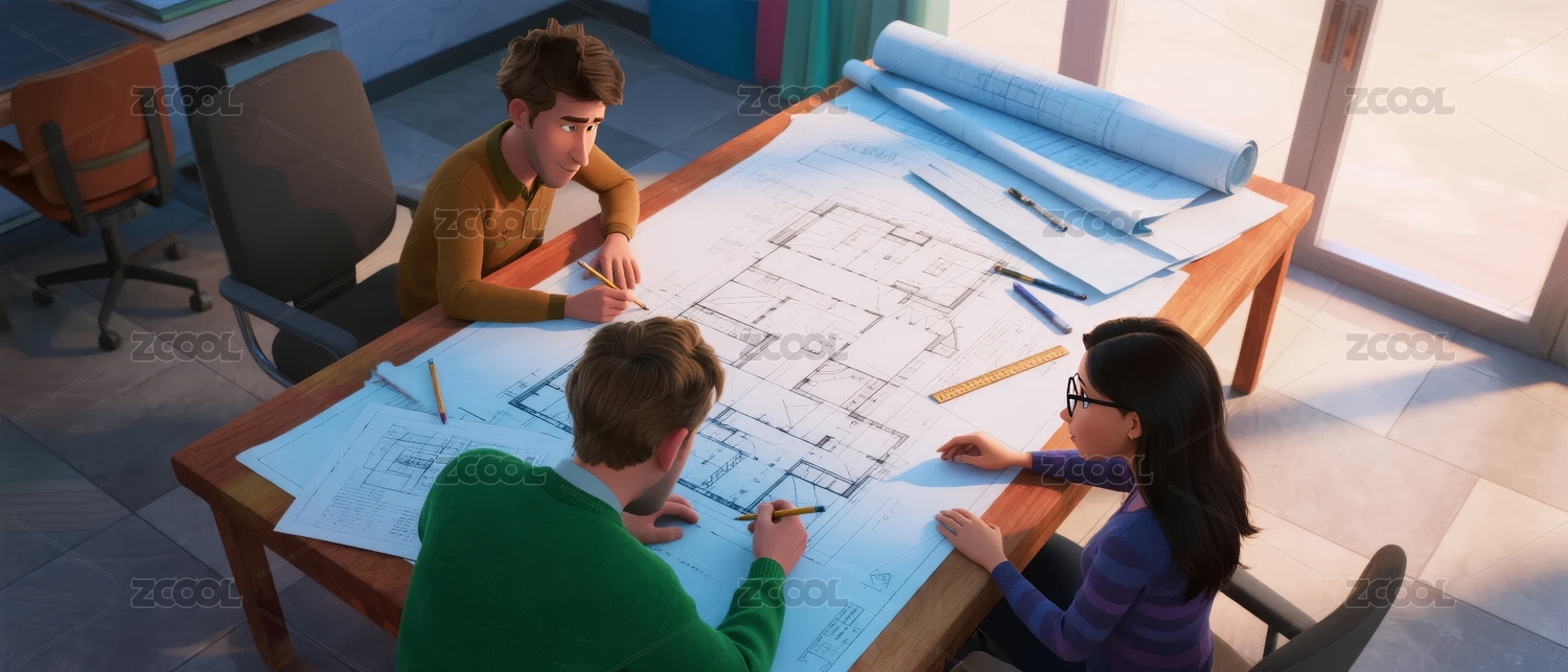 三人协作绘制建筑蓝图