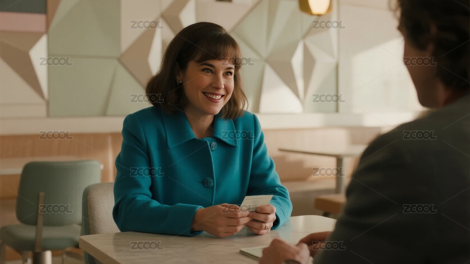 咖啡馆中微笑交谈的两人