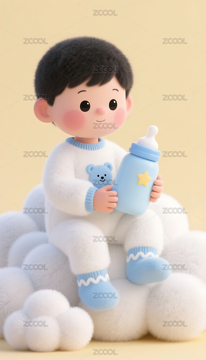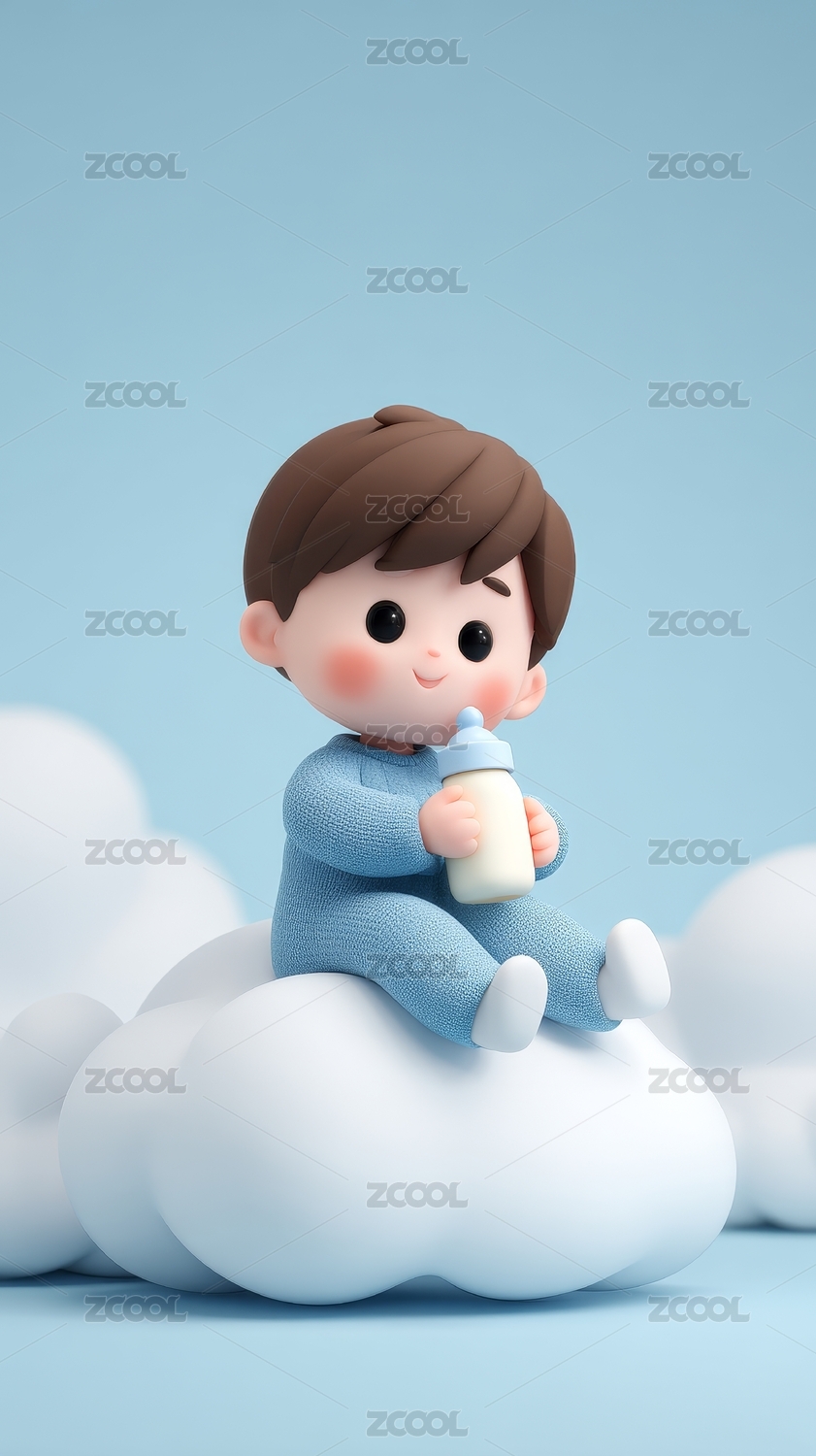 卡通婴儿手持奶瓶坐云朵