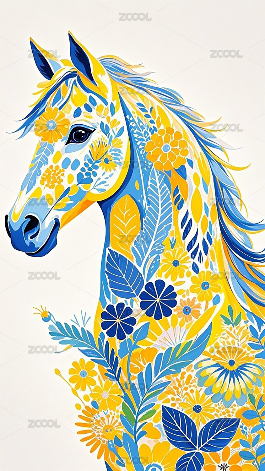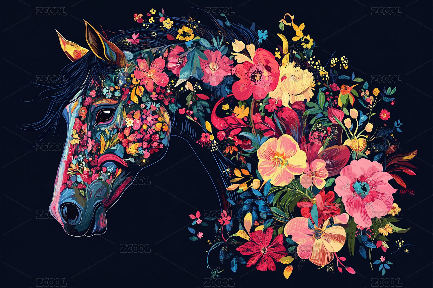 插画,骏马,花卉,装饰,艺术,色彩,手绘,纹样,童话,梦幻