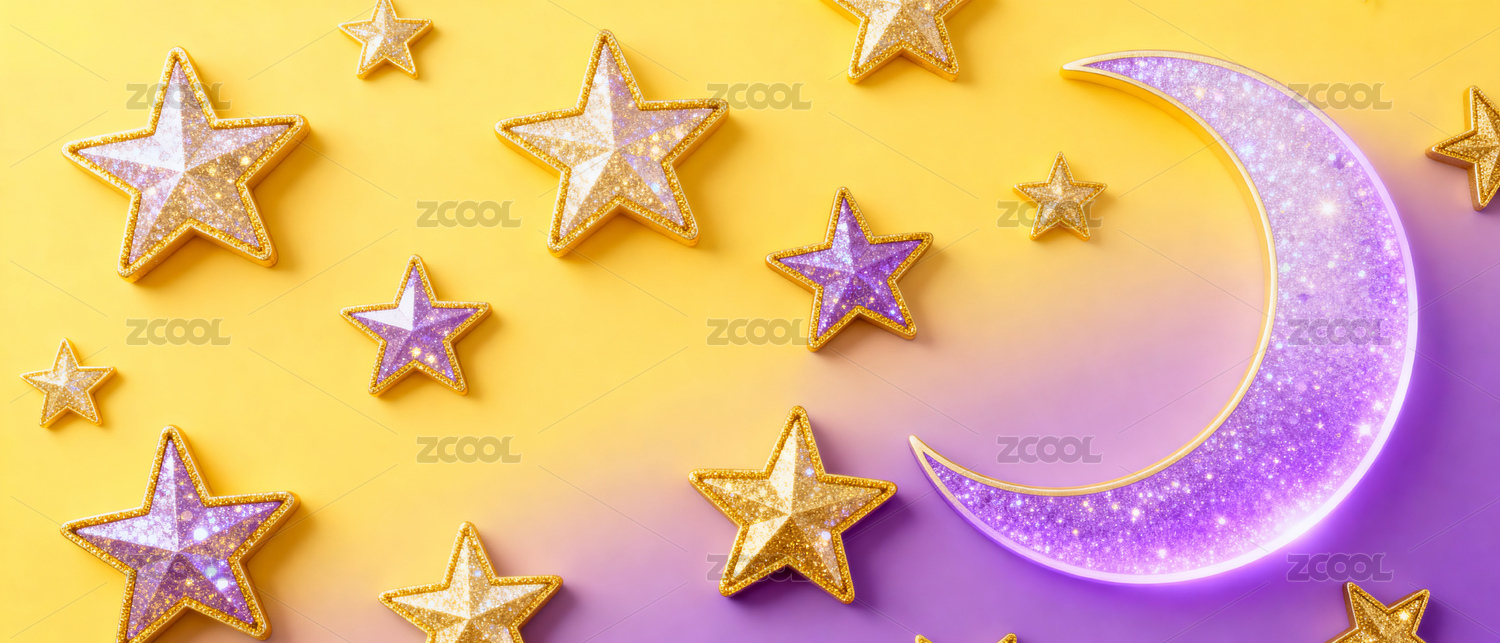 紫色月亮与金色星星装饰背景