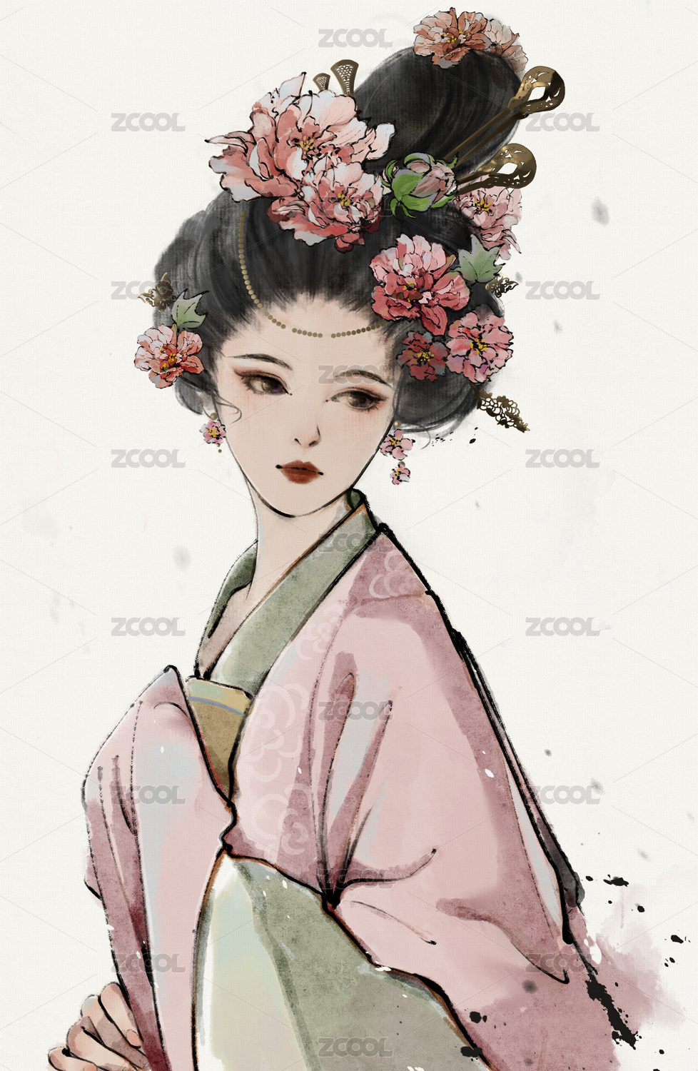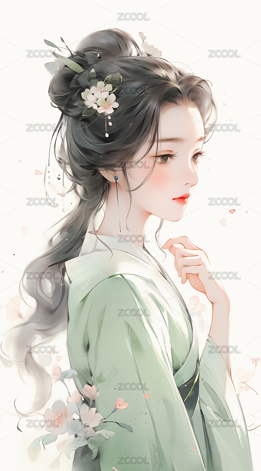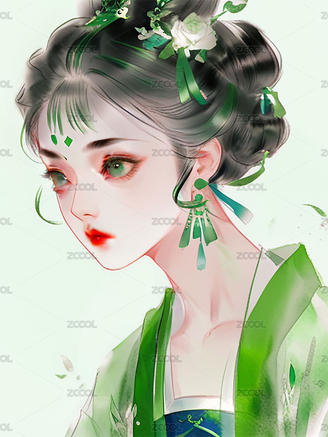 人物, 发饰, 荷花, 绿色衣服, 粉红色腰带