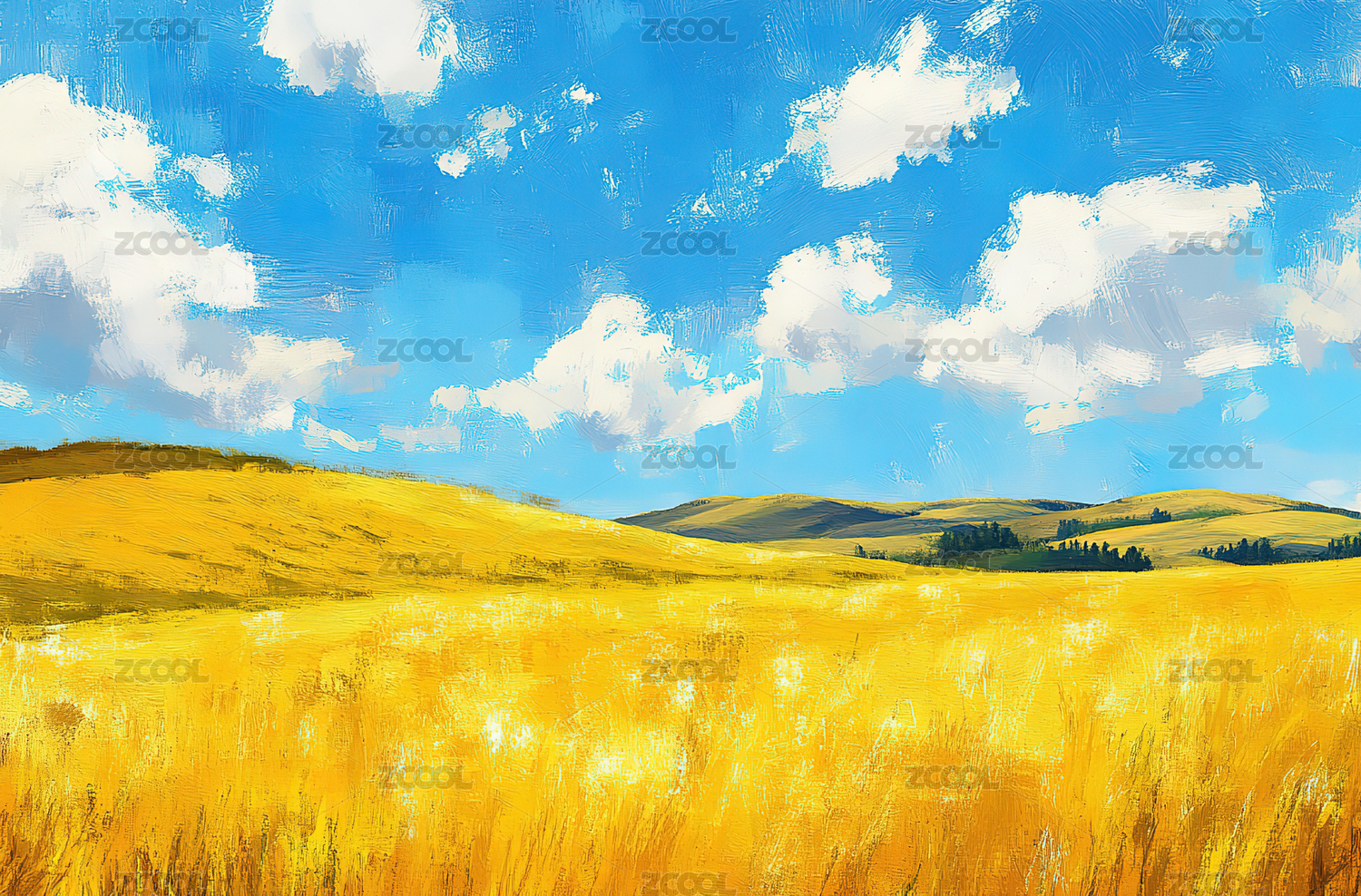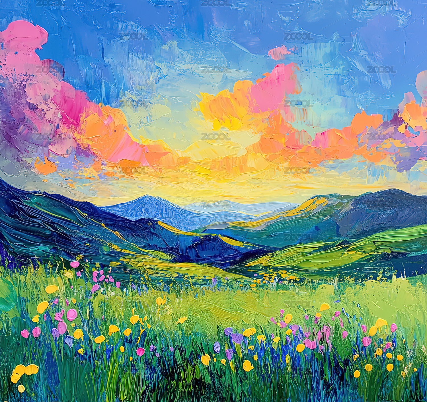 阳光明媚绿色田野风景油画抽象装饰画背景