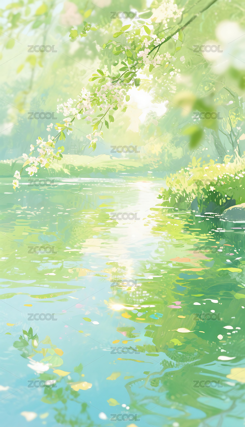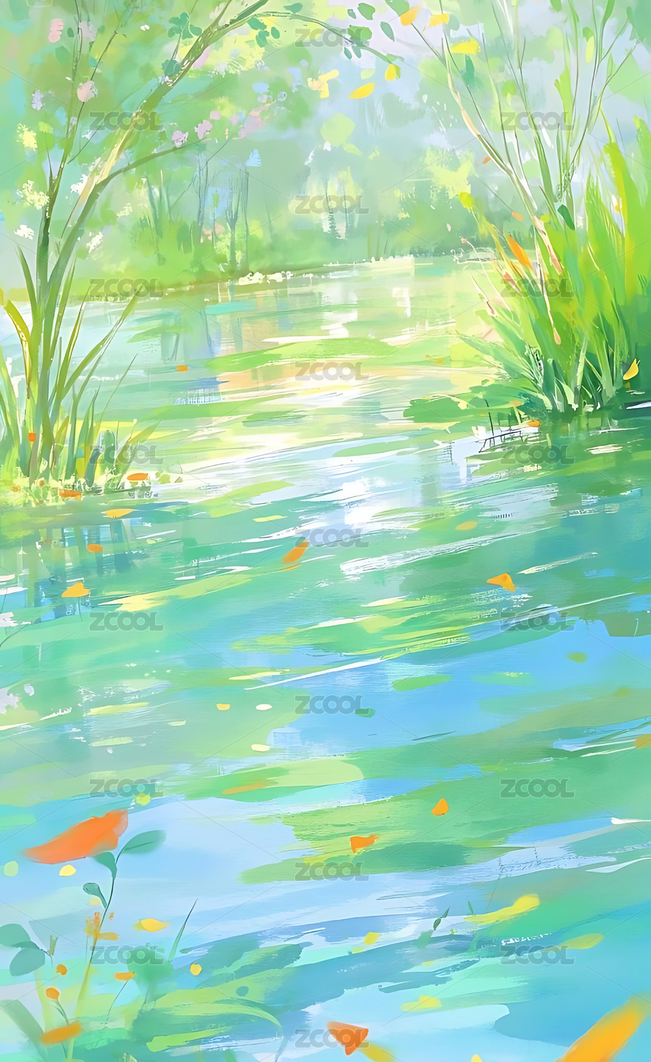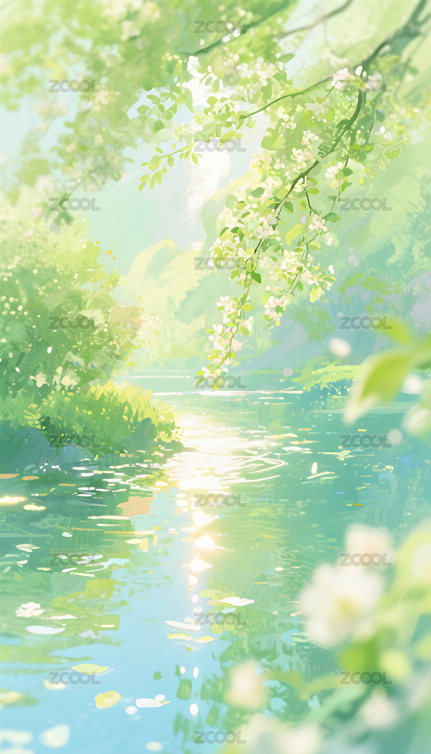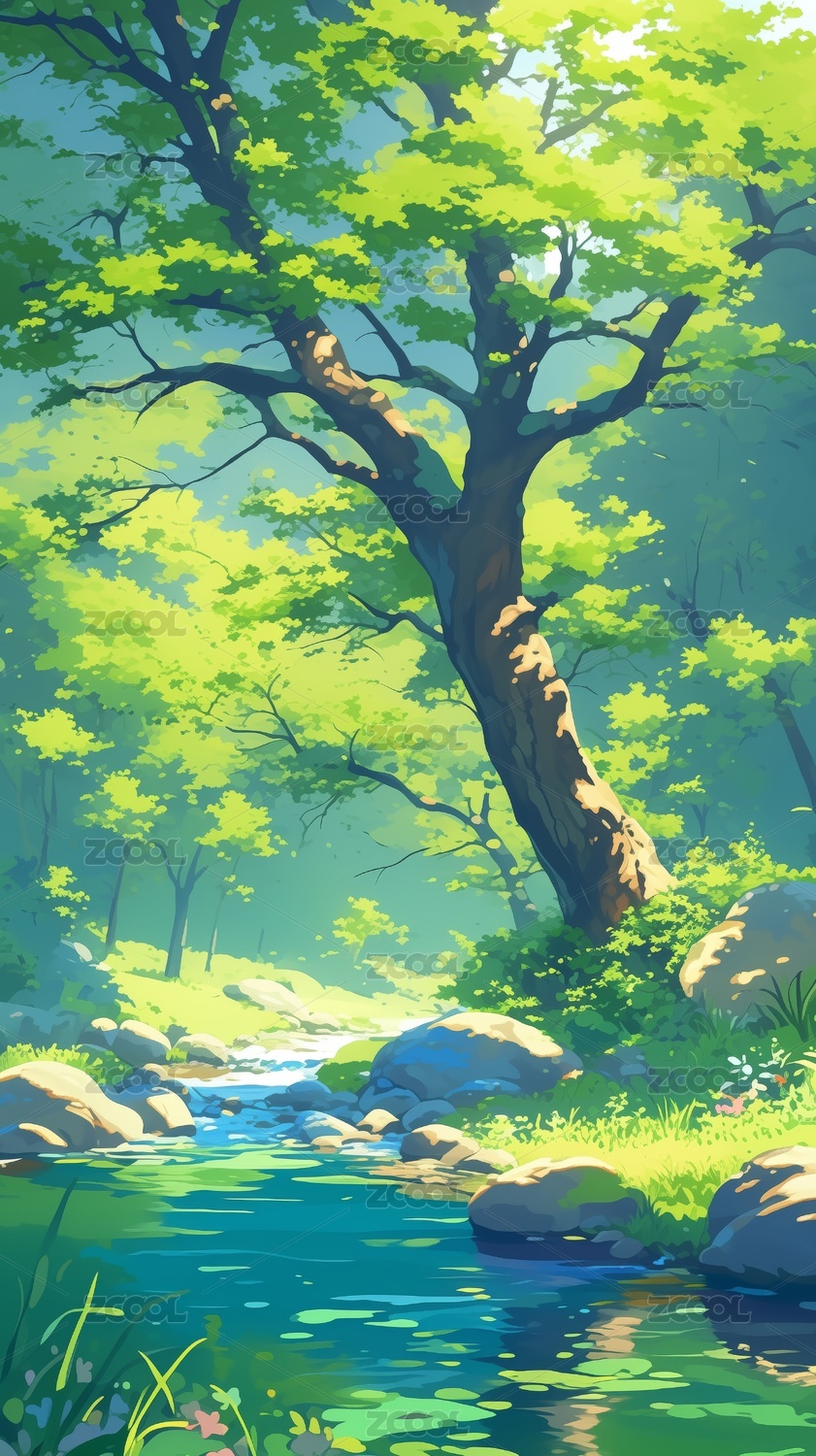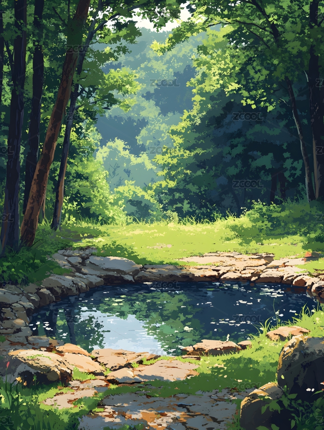 幽静绿色茂密森林中的清澈小溪插画绘画