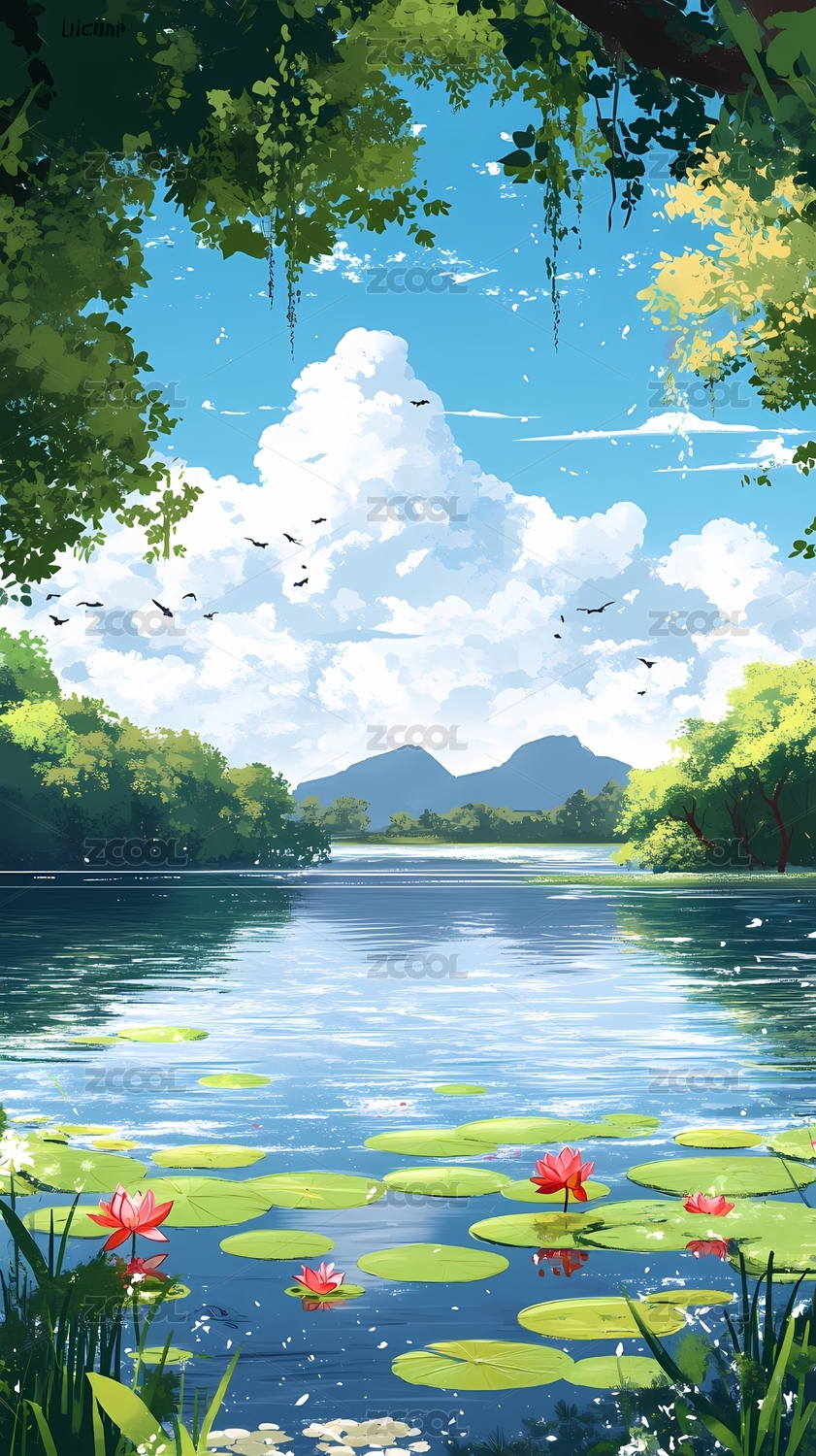 手绘卡通蓝色天空下的森林湖泊风景插画